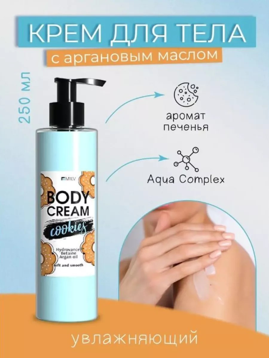 Крем для тела Milv Печенье 250 мл Нежный крем для тела с аппетитным ароматом печенья быстро впитывается, смягчает кожу, и не вредит фигуре. В состав средства входит Aqua Complex, обладающий великолепными увлажняющими свойствами.Увлажнение в течение 12 часов.