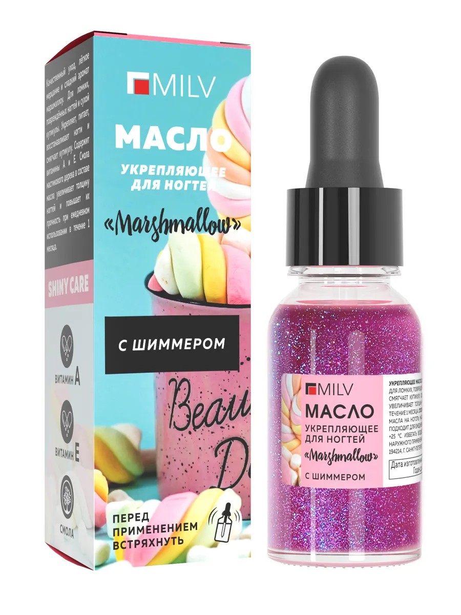 | Package contents | Strengthening nail oil with mastic resin and shimmer "MARSHMALLOW". 15 ml; bottle with a pipette; branded box. |