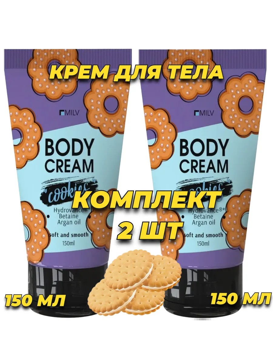 Set of 2 Cookie-Scented Body Creams. This delicate body cream with a delicious cookie scent absorbs quickly, softens skin, and is gentle on your figure. It contains Aqua Complex, which has excellent moisturizing properties. The active moisturizing formula of Aqua Complex provides effective hydration, argan oil is a source of omega-9, linoleic acid, and vitamin E, and betaine maintains the hydrolipidic balance and prevents moisture loss. Suitable for all skin types. Its non-sticky texture absorbs quickly. Directions: Apply a small amount of cream to clean, dry skin. Suitable for daily use.