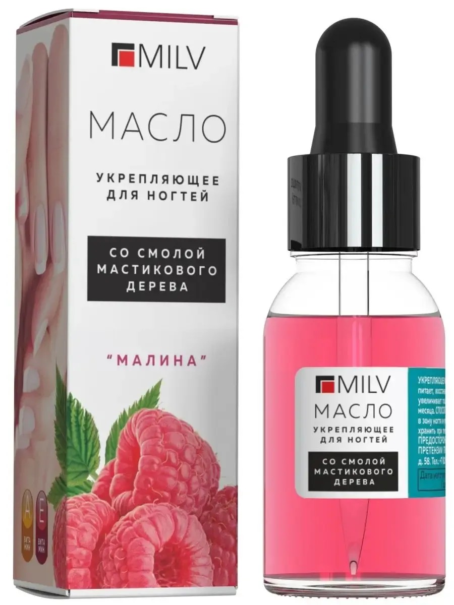 Strengthening nail and cuticle oil with mastic resin "Raspberry." This oil is specially formulated for brittle, damaged nails and dry cuticles. This cuticle oil strengthens, nourishes, and restores nails and softens cuticles. Contains vitamins A and E. Mastic resin increases nail thickness and strength with daily use for 1 month.