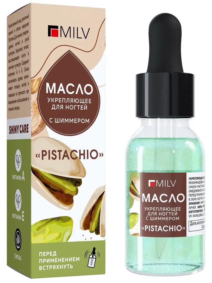 This oil is specially formulated for brittle, damaged nails and dry cuticles. It strengthens, nourishes, and restores nails, and softens cuticles. Contains vitamins A and E. Mastic resin increases the thickness and strength of nails with daily use for 1 month. SHINY CARE is a proven strengthening oil formula in a new interpretation: fine SHIMMER particles will give your skin a subtle shimmer; the vibrant PISTACHIO aroma will reveal nutty notes of pistachio, almond, rum, and vanilla, highlighting elegance, originality, and nobility. Directions: Shake the bottle before use. Apply a drop of oil to your nail. Massage into the nail and cuticle area. Do not rinse. Suitable for daily use.