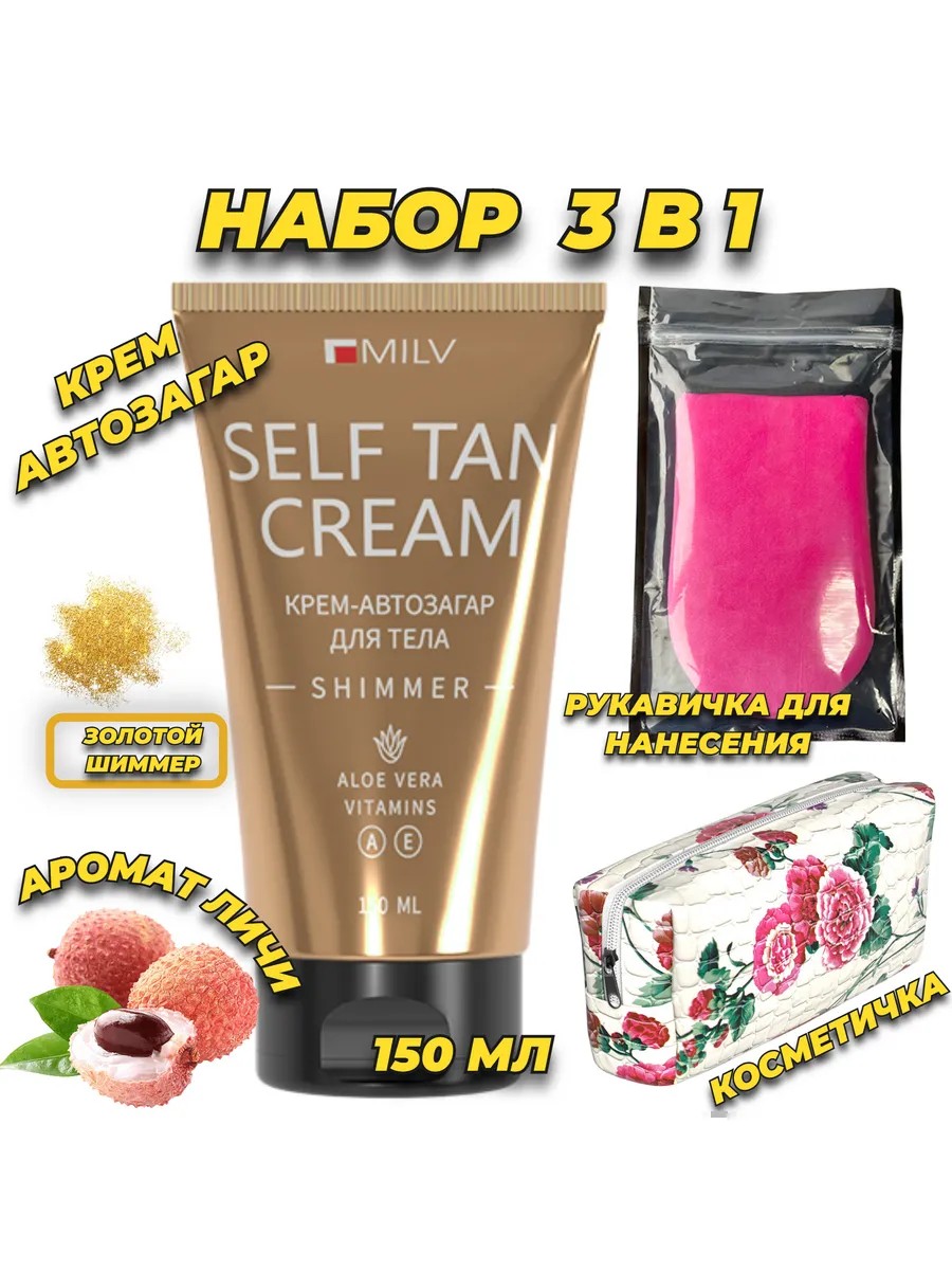Набор автозагар крем, косметичка и перчатка для нанесения автозагара. Milv автозагар для тела и лица темного оттенка с шиммером придаст вашему образу свежесть и яркость и сделает ваш образ более выразительным. Автозагар для ног еще называют жидкие колготки для ног крем или жидкие колготки для ног с шиммером позволят подчеркнуть ваши достоинства, придавая уверенности и элегантности. Благодаря своему уникальному составу, загар для тела и лица не только окрашивает кожу, но и увлажняет ее, делая кожу бархатистой на ощупь.
