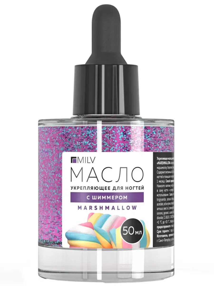 Укрепляющее масло для ногтей и шиммером "MARSHMALLOW" MILV - это идеальное средство для тех, кто стремится к здоровым и сильным ногтям. Содержание в составе смолы мастикового дерева, витамина А и витамина Е способствует питанию и увлажнению кутикулы, а также укреплению ногтевой пластины. Аромат маршмеллоу добавляет удовольствие от процесса ухода за ногтями. Это косметическое средство подходит для маникюра и педикюра, обеспечивая комплексный уход за кутикулой. Благодаря уникальной косметической базе, масло легко впитывается, не оставляя жирных следов. 50 мл продукта достаточно для долгого использования, делая его выгодным выбором для тех, кто ценит качество и эффективность.