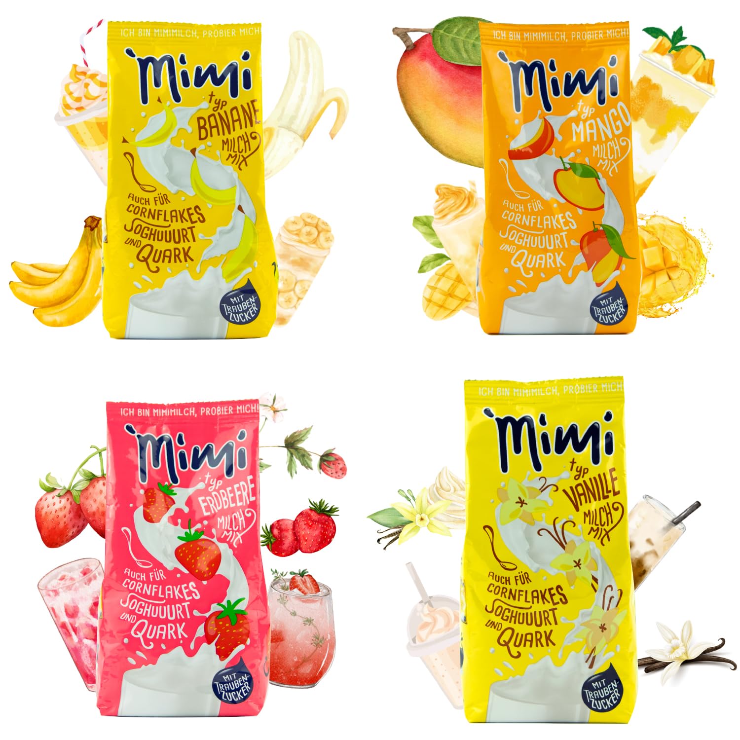 Milk soluble powdered drink with 4 flavors - Banana, Strawberry, Mango, Vanilla INGREDIENTS Sugar, Glucose, Fruit Powder, FlavorING DIRECTIONS FOR USE Add 3 to 4 teaspoons of Mimi Milk Mix (20 g) to a glass of milk (200 ml). Stir and enjoy! Unlimited uses: Enjoy our summer drinks hot or cold, with milk or milk substitutes, in yogurt, on cereal, in cottage cheese, in a smoothie or in a shake - there are no limits to your creativity. Breakfast upgrade: Add some extra oomph to your breakfast with MIMI drink powders! Strawberry, banana, mango and vanilla milk offer a variety of taste experiences that will delight your senses. Fruity variety: Discover the fruity freshness of our milk mix varieties and give every child's breakfast an extra portion of variety - without the classic cocoa, with full taste!. ? PERFECT SOLUTION: Our milk mix powders dissolve effortlessly and transform your creations into real palate delights - whether in a smoothie, cottage cheese or other delicious variations!. Discover diversity: Dive into the world of MIMI MILCH MIX and discover four delicious varieties: banana milk, strawberry milk, manomix, and vanilla. Enjoy a summer refreshment that revives your senses. Boisson en poudre soluble dans le lait avec 4 saveurs - Banane, Fraise, Mangue, Vanille INGRÉDIENTS Sucre, glucose, poudre de fruits, arôme MODE D'EMPLOI Ajoutez 3 à 4 cuillères à café de mélange de lait Mimi (20 g) dans un verre de lait (200 ml). Remuez et dégustez ! Possibilités d'utilisation illimitées : profitez de nos boissons d'été chaudes ou froides, avec du lait ou des substituts de lait, dans le yaourt, sur les céréales, dans le fromage cottage, dans le smoothie ou dans le shake - votre créativité n'a pas de limites. Mise à niveau du petit déjeuner : ajoutez de l'élan à votre petit déjeuner avec les poudres de boisson MIMI ! La fraise, la banane, la mangue et le lait de vanille offrent une variété d'expériences gustatives qui raviront vos sens. Variété fruitée : découvrez la fraîcheur fruitée de nos variétés de mélange de lait et donnez à chaque petit-déjeuner enfant une portion supplémentaire de variété – sans le cacao classique, avec plein goût !. ? SOLUTION PARFAITE : nos poudres de mélange de lait se dissolvent sans effort et transforment vos créations en véritables plaisirs du palais – que ce soit dans un smoothie, un fromage cottage ou d'autres délicieuses variations !. Découvrir la diversité : plongez dans le monde du MIMI MILCH MIX et découvrez quatre délicieuses variétés : lait de banane, lait de fraise, manomix et vanille. Profitez d'un rafraîchissement estival qui ravive vos sens.