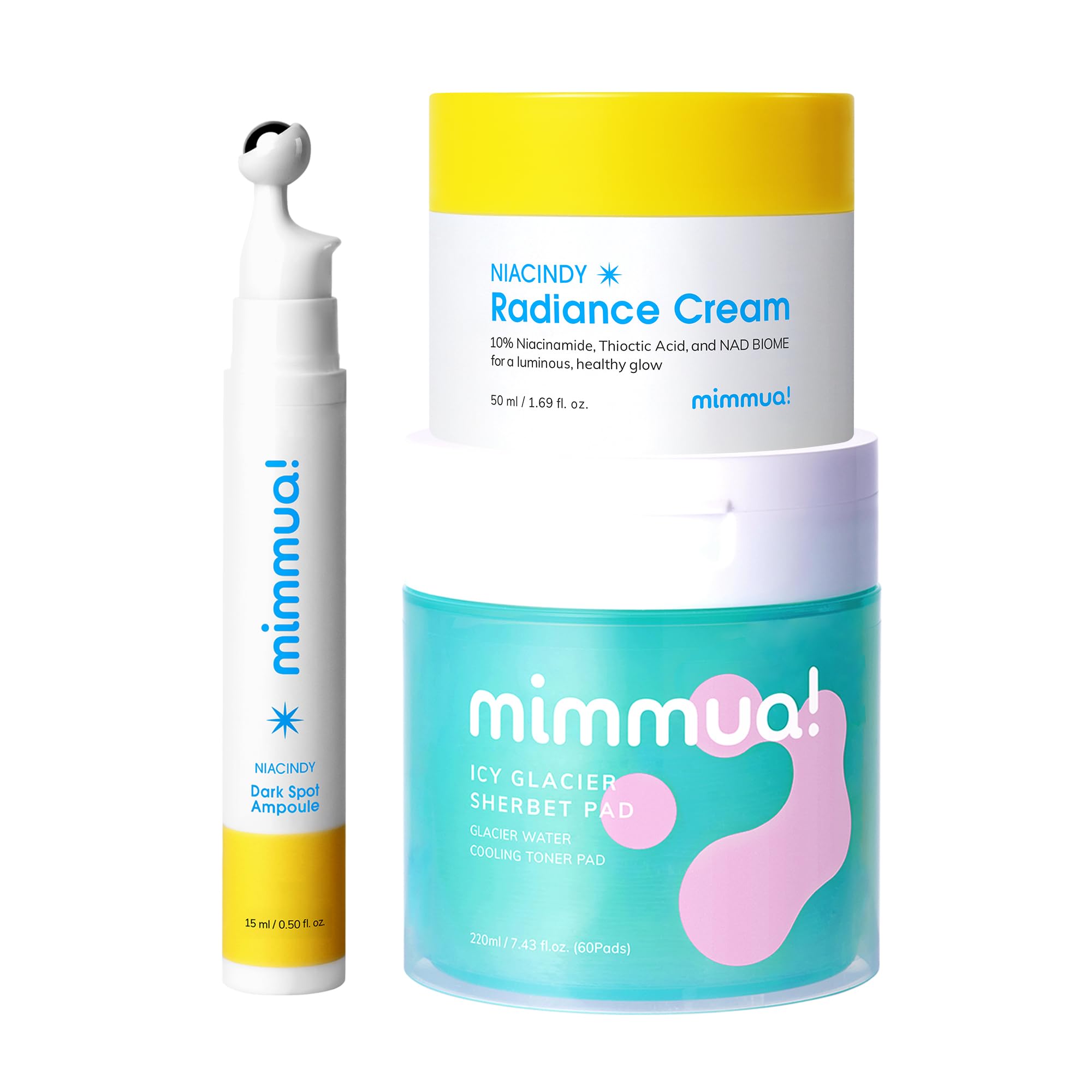 Reveal clearer, brighter, and more radiant skin with the mimmua! Brightening Dark Spot Care Bundle, a 3-step routine designed to depuff, treat hyperpigmentation, and deeply moisturize for a glowing finish. This dermatologist-inspired system helps target stubborn dark spots, dullness, discoloration, and uneven texture. Step 1 – Ice Sorbet Toner Pads: These refreshing toner pads contain 30 glacial water and caffeine to visibly reduce puffiness and under-eye bags while prepping the skin for better absorption of treatment products. The gel pads also calm sunburned skin and deliver an instant cooling effect for a lifted, revitalized complexion. Step 2 – Dark Spot Ampoule: Powered by NAD BIOME, Thioctic Acid 0.01 , and Niacinamide 10 , this clinical-strength ampoule works overnight to fade dark spots, melasma, acne scars, and overall discoloration. It helps even skin tone while supporting healthy cell renewal for improved brightness and clarity. Step 3 – NIACINDY Radiance Capsule Cream: This luxurious cream features Liposomal NAD, 10 Niacinamide, and Thioctic Acid to brighten, smooth, and strengthen the skin barrier. Encapsulated ingredients deliver maximum potency for both dark spot reduction and anti-aging benefits, leaving the skin moisturized, radiant, and visibly renewed. Together, this 3-step bundle delivers powerful brightening care—from preparation and treatment to long-lasting hydration—for your most luminous and even-toned skin. : A powerful antioxidant that helps fade existing discoloration, repair skin damage, and improve overall clarity. :NAD Biome (Nicotinamide Adenine Dinucleotide) is an alternative to NMN, offering another way to support healthy NAD levels. NAD helps boost cellular energy, supports skin repair, and may restore radiant, youthful skin. - : Each soft pad absorbs 60x more essence than regular toner pads—delivering deep hydration in a refreshing sorbet format that melts into skin. : Packed with Glacial Water, Willow Bark, Peppermint, and Caffeine, it soothes overheated skin, minimizes sensitivity, and recharges tired skin. : Delivers an immediate cooling effect, lowering the skin temperature by up to 44.6 F, reducing morning swelling, facial heat, and visible redness from sun exposure and irritation.