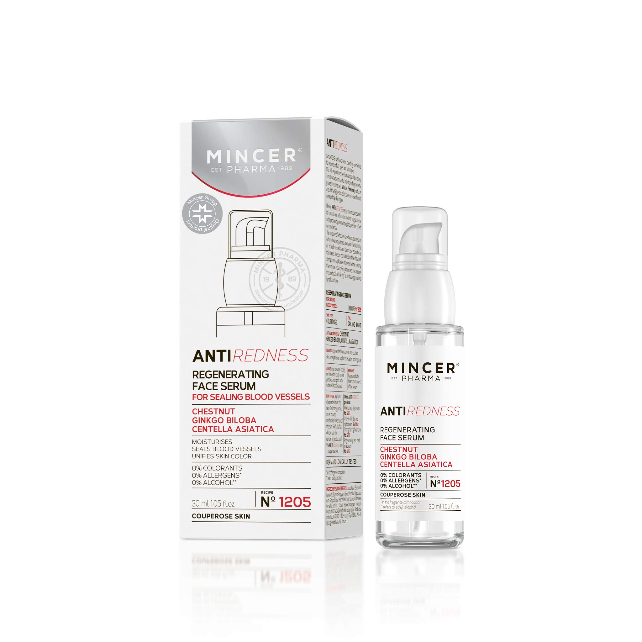 The AntiRedness line for rosacea contains active ingredients with a proven beneficial effect on capillary walls. The combination of horse chestnut and Japanese ginseng soothes and balances the skin, while escin in chestnut strengthens blood vessels and restores their elasticity. 0 colorants, 0 allergens, 0 alcohol. INGREDIENTS Aqua Water, Saccharidose Isomerate, Glycerin, Propylene Glycol, Aesculus Hippocastanum (Hippocastanum) Leaf Extract, Ginkgo Biloba (Ginkgo Biloba) Leaf Extract, Hedera Helix (Ivy) Leaf Extract, Vaccinium Vitis Idaea (Vagina) Leaf Extract, Centella Asiatica (Centella Asiatica) Extract, Hydroxypropyl Guar Oil, Troxerutin, Disodium EDTA, DMDM Hydantoin, Iodopropynyl Butylbutylbutylethanol. amate - Coceth 7, PPG-1-PEG-9 Lauryl Glycol Ether, PEG-40 Hydrogenated Castor Oil Parfum.Regular use: revitalized, hydrated, and soothing skin strengthened blood vessels even skin tone restores a healthy complexion. Healthy appearance – skin affected by rosacea requires special care – soothes redness, improves blood vessel flexibility, and reduces sensitivity to irritants. Active ingredients: chestnut, ginkgo biloba, centella asiatica. Indications: protection, maintenance, visible improvement of skin tone, and slowing of the aging process. Regenerating face serum to close blood vessels for rosacea, day and night.Mincer Pharma Anti-Redness Hydratant régénérant Couleur uniforme pour le visage Sérum pour Couperose Peau avec Chestnut, Ginkgo Biloba, Centella Asiatica 30 mlDESCRIPTION DU PRODUIT DESCRIPTION DU PRODUIT La ligne AntiRedness pour couperose de la peau contient des ingrédients actifs avec un effet bénéfique prouvé sur les parois capillaires. La combinaison de marronnier et de ginseng japonais apaise et équilibre la peau, tandis que l'Éscine dans le châtaignier renforce les vaisseaux sanguins et restaure leur élasticité. 0 colorants, 0 allergènes, 0 alcool. INGRÉDIENTS Aqua water, saccharide isomerate, glycérine, propylène glycol, Aesculus Hippocastanum, Gingko Biloba, Hedera Helix (Ivy), Vaccinum Vitis Idaea, Centella Asiatica Extract, Hydroxypropylguar, Troxerutin, Disodium EDTA, DMDM Hydantoin, Iodopropynyl butylbutylbutyl. amate - Coceth 7, PPG-1-PEG-9 Lauryl Glycol Ether, PEG-40 Hydrogenated Castor Oil Parfum.Utilisation régulière : peau revitalisée, hydratante et apaisante. vaisseaux sanguins renforcés. Même couleur de peau. Restaure un teint sain. Aspect sain - La peau de couperose nécessite un soin particulier - Apaise les rougeurs, améliore la flexibilité des vaisseaux sanguins et diminue la sensibilité aux agents irritants. Ingrédients actifs : châtaigne, ginkgo biloba, centella asiatica. Indications : protection, entretien, amélioration visible du teint de la peau et ralentissement des processus de vieillissement. Sérum visage régénérant pour fermer les vaisseaux sanguins pour couperose jour et nuit.