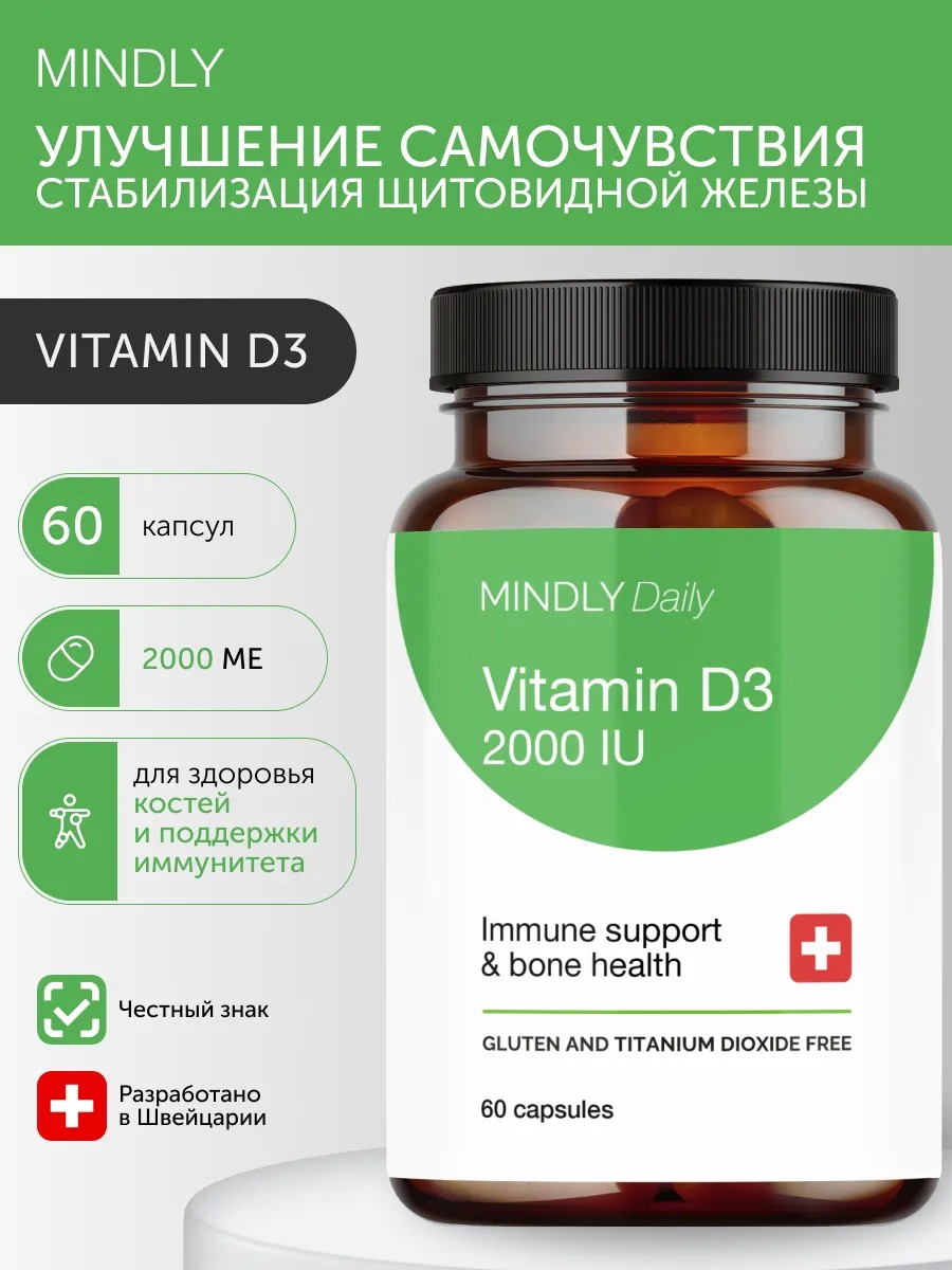 MINDLY Витамин D3, Д3 2000 МЕ для иммунитета 60 капсул