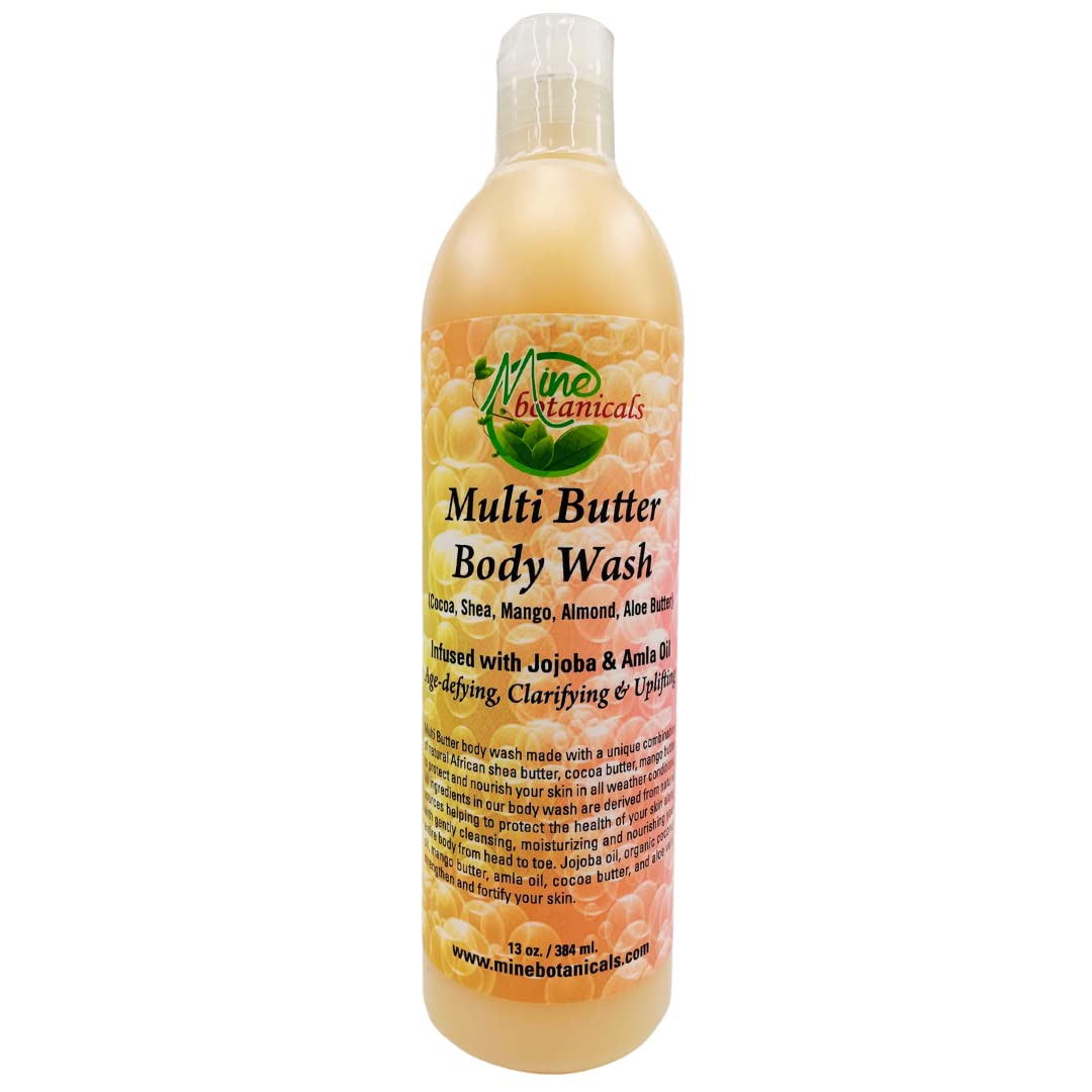 Multi Butter Body Wash (Cocoa, Shea, Mango, Almond, Aloe Butter) Infused with Jojoba Amla Oil Age-defying, Clarifying Uplifting Multi Butter body wash made with a unique combination of natural African shea butter, cocoa butter, mango butter to protect and nourish your skin in all weather conditions. All ingredients in our body wash are derived from natural sources helping to protect the health of your skin along with gently cleansing, moisturizing and nourishing your entire body from head to toe. Jojoba oil, organic coconut oil, mango butter, amla oil, cocoa butter, and aloe vera strengthen and fortify your skin. Use: Wet hair and skin with warm water. Apply to washcloth or hands, lather, gently massage over entire body and scalp, then rinse. Or add a capful to warm water to create a spa bath. For external use only. Avoid contact with eyes. Natural ingredients may vary in color and consistency. If irritation occurs, discontinue use. Ingredients: Deionized Water, Raw Butyrospermum Parki (Shea Butter), Mango Butter, Almond Butter, Aloe Butter, Jojoba Oil, Amla Oil, Avocado Oil, Coconut Oil, Cocoa Seed Butter, Jojoba Oil, Rosemary Oil, African Black Soap, Vegetable Glycerin, Tocopherol (Vitamin-E), Palm Kernel, Olea Europea (Olive Oil), Aloe Barbadensis Leaf Juice, Sodium Lauryl Sulfate, Sodium Methyl Cocoyl Taurate, Cocamidopropyl Betaine, Cocamide DIPA, Glycol Distearate, Laureth-4, Hamamelis Virginiana (Witch Hazel) Distillate, Organic Chamomilla Recutita (Chamomile) Flower Extract, Phenoxyethanol, Ethylhexylglycerin, Caprylyl Glycol, Hexylene Glycol, Citric Acid, Sodium Chloride, Grapefruit Seed Extract, Fragrances (Essential Oil Blend). 13 oz Made in the USA