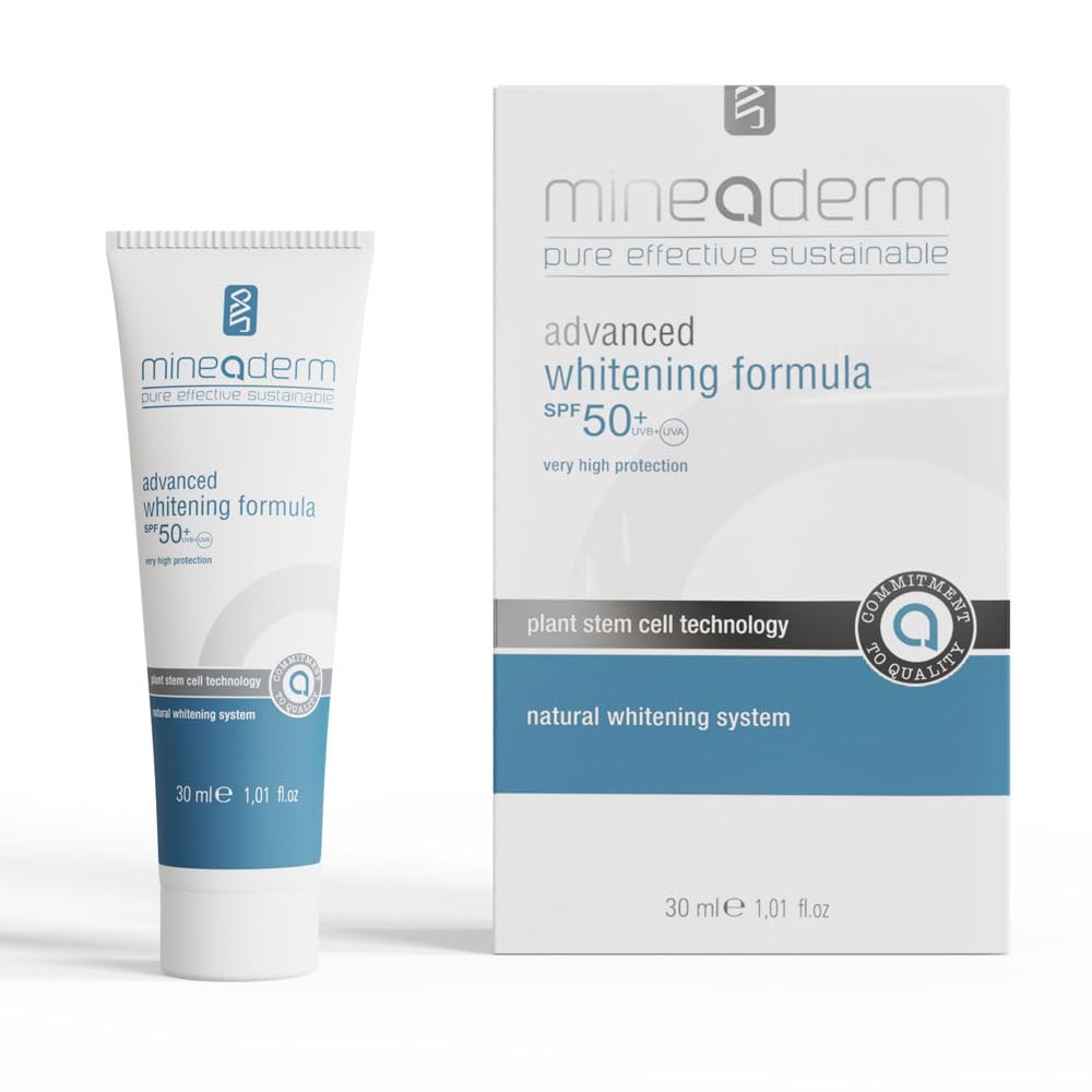 Mineaderm Advanced Whitening Formula SPF 50 has been developed for the daily care of demanding skin that needs both protection and radiance. The combination of powerful active ingredients such as niacinamide, plant-based brighteners (Rumex, Bellis, Licorice root), and stem cell technology promotes an even and radiant complexion. The cream offers highly effective broad-spectrum protection against UVA and UVB rays, reduces the first signs of premature aging, and supports skin tone balance. Its lightweight, fast-absorbing formula makes it ideal for daily use, even under makeup. SAFETY WARNING Directions for use: Apply a thin layer of the product and massage gently until completely absorbed. Use regularly, twice a day, morning and evening. Store at room temperature and out of reach of children. Test and apply the patch to the inside of your wrist. Avoid contact with the eye area. For external use only.