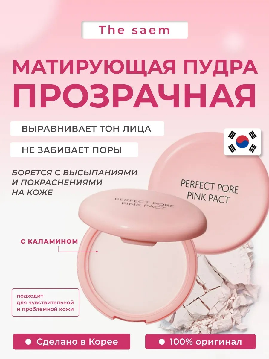 The Saem Saemmul Perfect Pink Pact compact mattifying face powder (Korea) with calamine is ideal for sensitive and problematic skin. It perfectly conceals enlarged pores, wrinkles, dark circles under the eyes, and other skin imperfections, creating the effect of a perfectly smooth and matte complexion. The pink powder becomes translucent on the face. This Korean mineral powder contains mineral components that allow the skin to breathe and do not overdry it. The Saem pink powder with calamine contains calamine, jasmine extract, and ylang-ylang oil. Calamine effectively relieves redness and irritation, promotes rapid skin regeneration, and prevents the formation of post-acne marks. Jasmine extract tones and soothes the skin, smoothing its texture, and ylang-ylang oil nourishes sensitive skin, eliminates flaking and wrinkles, and improves complexion. Mattifying mineral powder protects the skin from harmful environmental influences. It has a perfect matte finish and prevents shine throughout the day. The compact format is convenient to carry in your bag and allows you to touch up your makeup at any time.