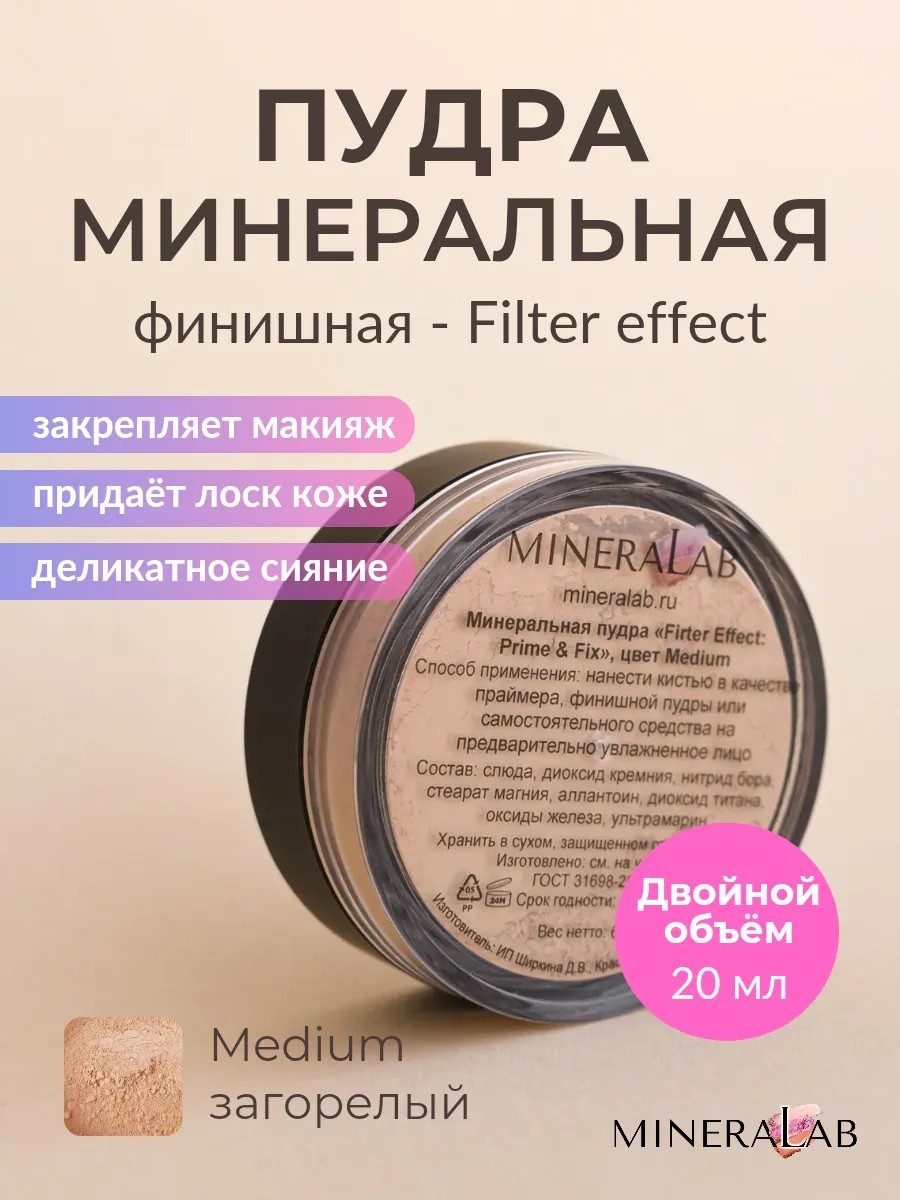 Финишная минеральная рассыпчатая пудра для лица Filter Effect даёт эффект фотошопа - лёгкого блюра и тонкое сияние. "Полирует" кожу, добавляет лоск и холёность. Делает её визуально более ровной, ухоженной и привлекательной. Снижает видимость пор и морщинок. Словно вуаль ложится тонко и незаметно, преображая вашу кожу. Обладает матирующими свойствами, уменьшает жирный блеск, визуально выравнивает и разглаживает поверхность кожи. Надёжно закрепляет макияж, повышает его стойкость, работает как фиксатор. Формула продукта разработана с учетом всех потребностей кожи, обеспечивая легкое и невесомое покрытие. Этот продукт подойдет для любой косметической рутины благодаря своей универсальности. Может служить подложкой перед нанесением тональной основы или для лучшей растушевки теней в складке века. Помогает сглаживать переходы между косметическими продуктами: румянами, бронзером, скульптором и пр., соединяя в законченный образ. Для всех типов кожи, в том числе чувствительной. Эта косметика станет отличным дополнением к вашему арсеналу декоративной косметики, незаменимым помощником как для повседневного, так и для вечернего профессионального макияжа. На жирной и комбинированной коже рекомендуем наносить только на периферию, избегая Т-зоны, т.к. пудра с сиянием. Из природных минералов, гипоаллергенный. Поэтому подходит людям с куперозом, розацея и чувствительной кожей. Без талька и крахмала, без чувства маски. Не забивает поры. Компоненты пудры обеспечивают натуральный, естественный внешний вид, позволяя коже дышать и не создавая ощущения тяжести. СПОСОБ ПРИМЕНЕНИЯ: небольшое количество наберите на пушистую кисть для пудры с синтетическим ворсом и нанесите аппликативными или полирующими движениями на необходимые участки лица. Упакована в удобную баночку с закрывающимся сифтером, чтобы продукт не рассыпался. Косметика MINERALAB сделана в России. Цвет Medium для загорелой кожи, практически прозрачная