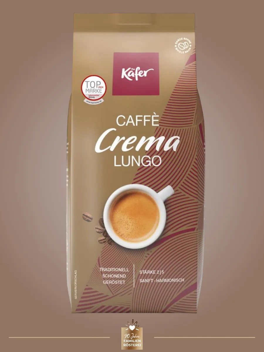 KÄFER Caffè Crema Lungo coffee beans are a harmoniously balanced blend of Arabica and Robusta.