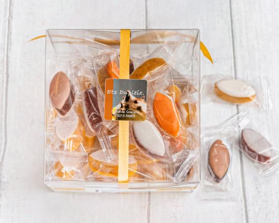 Mini fruity calissons, 300g box INGREDIENTS Ingredients: Calicitrons: mini lemon calissons Ingredients: almonds, candied melons (melons, glucose-fructose syrup, sugar), sugar, glucose-fructose syrup, concentrated lemon preparation 5 (lemon concentrate, acidity regulator: citric acid, lemon essential oil), sorbitol syrup, egg white, candied lemon peels 2 (lemon peels 52 , glucose-fructose syrup, sugar), invert sugar syrup, natural lemon flavor, unleavened bread (potato starch, sunflower oil), coloring foodstuff (safflower concentrate, lemon, apple) califigues: mini fig calisson Ingredients: Dried figs (23 ), almonds, sugar, candied melons (melons, glucose-fructose syrup, sugar), sugar syrup invert, glucose-fructose syrup, egg white, rice billets (rice, salt), unleavened bread (potato starch, sunflower oil), coloring foodstuffs (safflower and spirulina concentrate and safflower, lemon and apple concentrate). califramboises: mini raspberry calisson Ingredients: Almonds – candied melons (melons, glucose-fructose syrup, sugar) – sugar – glucose-fructose syrup – raspberry paste 8 (concentrated raspberry puree (57 ), fructose-glucose syrup, humectant: glycerol, glucose syrup, concentrated apple puree, sugar, vegetable fat (palm oil), concentrated juice elderberry, acidity regulator: malic acid, flavor, emulsifier: sunflower lecithin), egg whiteCHRISTMAS BOX. CALISSON. GIFT. Mini calissons fruités, coffret de 300gr INGRÉDIENTS Ingrédients: Calicitrons : mini calissons au citron Ingrédients : amandes, melons confits ( melons, sirop de glucose-fructose, sucre), sucre, sirop de glucose-fructose, préparation concentrée de citron 5 (concentré de citron, correcteur d'acidité : acide citrique, huile essentielle de citron), sirop de sorbitol, blanc d'oeuf, écorces de citron confites 2 (écorces de citron 52 , sirop de glucose-fructose, sucre), sirop de sucre inverti, arome naturel de citron, pain azyme (fécule de pomme de terre, huile de tournesol), denrée alimentaire colorante ( concentré de carthame, citron, pomme) califigues : mini calisson à la figue Ingrédients : Figues sèches (23 ), amandes, sucre, melons confits (melons, sirop de glucose-fructose, sucre), sirop de sucre inverti, sirop de glucose-fructose, blanc d'oeuf, billettes de riz (riz, sel), pain azyme (fécule de pomme de terre, huile de tournesol), denrées alimentaires colorantes (concentré de carthame et de spiruline et concentré de carthame, citron et pomme). califramboises : mini calisson à la framboise Ingrédients : Amandes – melons confits (melons, sirop de glucose-fructose, sucre) – sucre – sirop de glucose-fructose – pâte à la framboise 8 ( purée concentrée de framboise(57 ), sirop de fructose-glucose, humectant : glycérol, sirop de glucose, purée concentrée de pomme, sucre, matière grasse végétale (huile de palme), jus concentré de sureau, régulateur d'acidité : acide malique, arome, émulsifiant : lécithine de tournesol), blanc d'oeufCOFFRET NOEL. CALISSON. CADEAU.