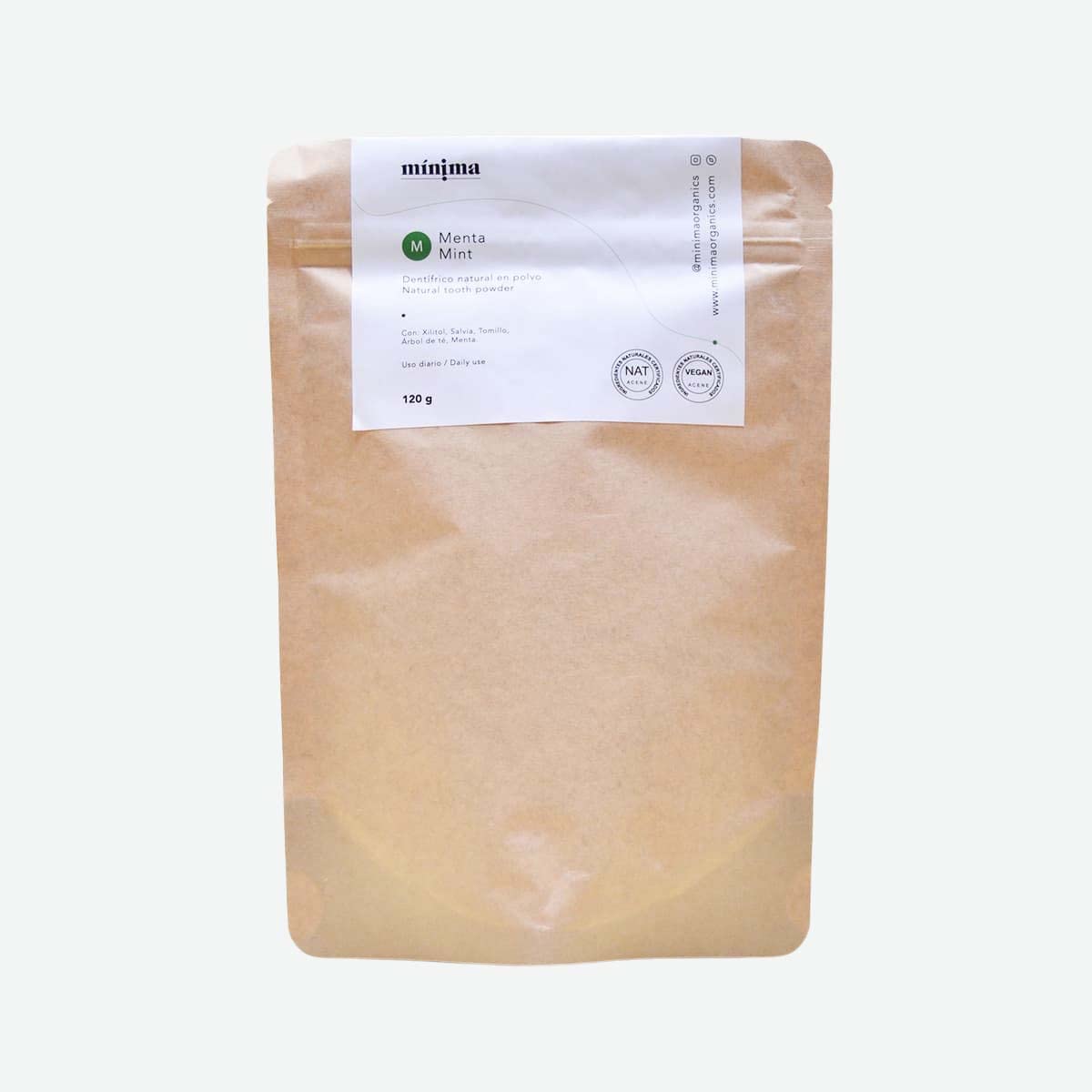 If you are looking for a sustainable selection and Zero Waste to conventional toothpaste, this eco-friendly toothpaste powder. It is locally produced and the innovative formula with 100 natural and organic ingredients cleans and protects your lips, foams and leaves fresh breath. It is made from antiseptic ingredients such as peppermint, thyme extract and tea tree oil. They help remove bacteria and toxins that build up in the mouth and let you enjoy healthier gums and teeth and fresh breath. This Minnima Organics powder toothpaste is sulfate, fluoride or triclosan free. The load is packed in bulk in a 100 compostable paper bag, available in 70g, 120g or 1kg. This convenient size allows you to fill the same metal tin or other glass container that you want to reuse at home. This is certainly the perfect plastic-free alternative to get much less waste in your bathroom. INGREDIENTS Tea Tree Oil, Sage Extract, Thyme Extract, Peppermint, White Clay INSTRUCTIONS FOR USE Lightly moisten the toothbrush and remove excess water. Then place the bristles on the tooth powder so that it remains sticky. As a habit, wash your teeth for 2 minutes and finally rinse with plenty of water. It is recommended to avoid contact with the eyes and not to eat this product. Not recommended under 3 years. See moreFree from sulfate, fluoride or triklosan. 100 Natural Ingredients. Eco Powder Toothpaste. Made in Spain.Dentryfic Mint Poeder - Composteerbare zak 120 g Als u op zoek bent naar een duurzame selectie en Zero Waste voor conventionele tandpasta, dan is dit milieuvriendelijke tandpasta poeder. Het wordt lokaal geproduceerd en de innovatieve formule met 100 natuurlijke en biologische ingrediënten reinigt en beschermt je lippen, schuimt en laat een frisse adem achter. Het is gemaakt van antiseptische ingrediënten zoals pepermunt, tijm extract en tea tree olie. Ze helpen bacteriën en gifstoffen te verwijderen die zich ophopen in de mond en laten u genieten van gezonder tandvlees en tanden en een frisse adem. Deze Minnima Organics poeder tandpasta is sulfaat, fluoride of triclosan vrij. De lading wordt in bulk verpakt in een 100 composteerbare papieren zak, verkrijgbaar in 70 g, 120 g of 1 kg. Met dit handige formaat kunt u dezelfde metalen blik of andere glazen container vullen die u thuis wilt hergebruiken. Dit is zeker het perfecte plasticvrije alternatief om veel minder afval in je badkamer te krijgen. INGREDIËNTEN Tea Tree Olie, Salie Extract, Tijm Extract, Pepermunt, Witte Klei GEBRUIKSAANWIJZING Bevochtig de tandenborstel licht en verwijder overtollig water. Plaats vervolgens de borstelharen op het tandpoeder zodat het plakkerig blijft. Was je tanden als gewoonte 2 minuten en spoel tenslotte met veel water. Het wordt aanbevolen om contact met de ogen te vermijden en dit product niet te eten. Niet aanbevolen onder de 3 jaar. Meer bekijkenVrij van sulfaat, fluoride of triklosan. 100 Natuurlijke Ingrediënten. Eco Powder Tandpasta. Gemaakt in Spanje.