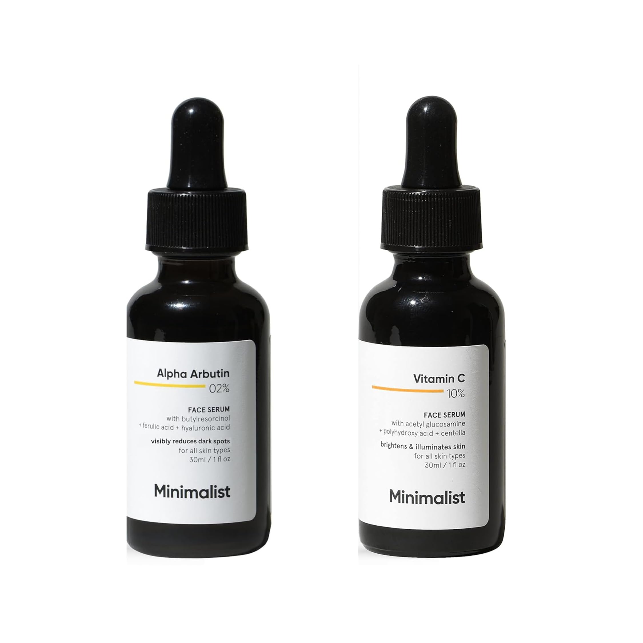 Achieve brighter, even, and radiant skin with the Minimalist Brightening Serum Combo, featuring two powerful serums designed to target dullness, pigmentation, and uneven skin tone: Minimalist 10 Vitamin C Serum (30ml) – Formulated with stable ethylene acid (86 pure vitamin C), this antioxidant-rich serum. reduces dullness, fades dark spots, protects against sun damage and increases skin hydration with acetylglucosamine and Centella water. Minimalist 2 Alpha Arbutin Serum (30ml) – a lightweight yet potential depigmentation serum clinically proven to reduce acne marks, tanning and photo damage. Alpha Arbutin from DSM Netherlands safely inhibits melanin production for visibly brighter, more balanced skin. Together, these two serums form the ultimate bright duo, providing hydration, glow and clarity to all skin types, including sensitive skin. SAFETY WARNING For external use onlyClean Safe Formulas: Both serums are fragrance-free, non-comedogenic, sulfate-free, paraben-free, silicone-free and safe for daily use in AM PM use. Hydrates and Soothes: Enriched with centella water, acetylglucosamine and aloe vera for calm, fluffy and nourished skin. Enhances radiance and glow: antioxidant-rich vitamin C brightens the skin, while Alpha Arbutin event for a visible radiant complexion. Fades Dark Spots Pigmentation: Vitamin C reduces melanin production while Alpha Arbutin minimizes hyperpigmentation and post-acne marks. Complete Brightening Duo: contains 10 vitamin C serum 2 alpha arbutin serum to combat dullness, pigmentation, tanning and acne spots.Minimalist Brightening Combo 10 vitamine C 2 alpha arbutine gezichtsserums vervagende donkere vlekken, pigmentatie acne merken boosts glow, hydratatie en zelfs huidtoon Voor dames en heren All Onveil helderder, gelijkmatige en stralende huid met de Minimalist Brightening Serum Combo, met twee krachtige serums ontworpen om dofheid, pigmentatie en een oneffen huidtint te doen: Minimalist 10 vitamine C-serum (30ml) – samengesteld met stabiel ethyleenzuur (86 pure vitamine C), dit antioxidant-rijke serum. reduces dullnessheid Vervagen donkere vlekken, beschermt tegen zonneschade en verhoogt de hydratatie van de huid met acetylglucosamine en Centella water. Minimalist 2 Alpha Arbutin Serum (30 ml) – een lichtgewicht maar potentieel depigmentatieserum klinisch bewezen om acne merken, tanning en fotoschade te verminderen. Alpha Arbutin van DSM Nederland remt de productie van melanine veilig voor een zichtbaar helderder, meer evenwichtige huid. Samen vormen deze twee serums de ultieme heldere duo, die hydratatie, glans en helderheid bieden aan alle huidtypes, inclusief de gevoelige huid. VEILIGHEIDSWAARSCHUWING Alleen voor uitwendig gebruikSchone en veilige formules: beide serums zijn geurvrij, niet-comedogenisch, sulfaatvrij, parabenvrij, siliconenvrij en veilig voor dagelijks gebruik in AM PM gebruik. Hydrateert en verzachtend: verrijkt met centellawater, acetylglucosamine en aloë vera voor een kalme, donzige en voedde huid. Versterkt de straling en glow: antioxidant-rijke vitamine C fleurt de huid op, terwijl Alpha Arbutin event voor een zichtbare stralende complexie. Fades Dark Spots Pigmentation: Vitamine C reduceert melanine productie terwijl Alpha Arbutin hyperpigmentatie en post-acne marks minimaliseert. Complete Brightening Duo: bevat 10 vitamine C serum 2 alfa arbutine serum om dofheid, pigmentatie, tanning en acne vlekken te bestrijden.