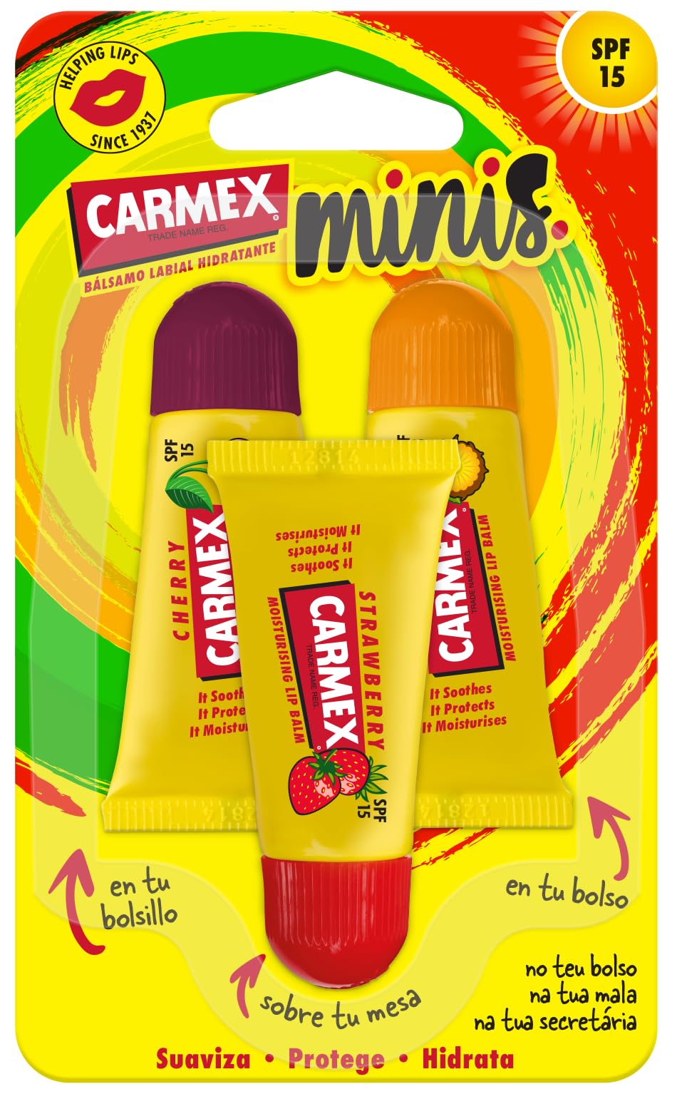 Het meest comfortabele en praktische formaat van Carmex in één verpakking. Je drie lippenbalsems met heerlijke fruitige aroma's en maximale bescherming in een mini-editie die je altijd bij je kunt hebben. Want het leven is vol avontuur en je lippen verdienen op elk moment de beste verzorging.