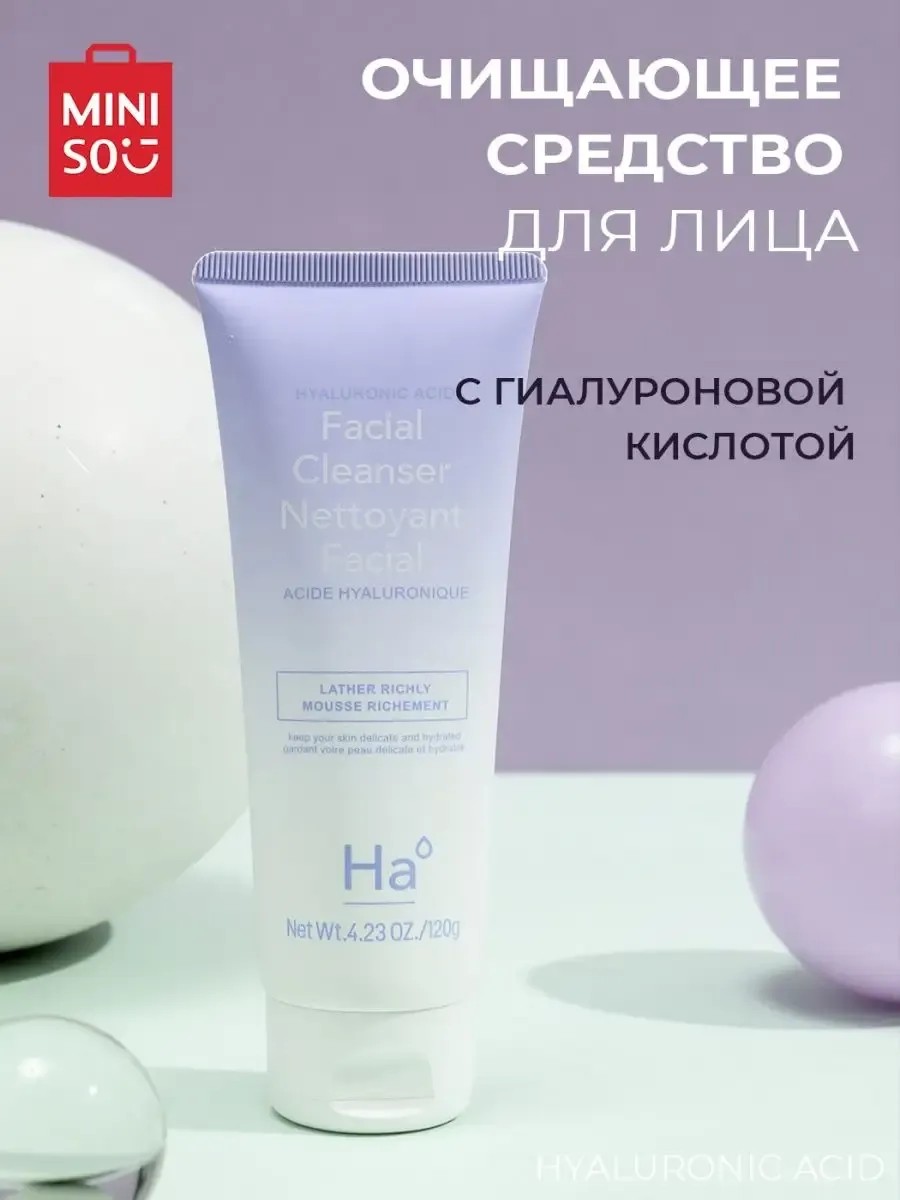 Hyaluronic Acid MINISO Facial Cleanser. This moisturizing cream with hyaluronic acid is designed for washing and gently removing makeup. It contains hyaluronic acid, which leaves skin clean, supple, and soft. This soap- and dye-free cleanser does not cause a feeling of tightness and is suitable for daily evening use on dry, combination, and normal skin. This creamy gel cleanser provides deep cleansing, gentle care, and comfort. Directions: Dispense the product into your hands, rub them together to create a lather. Massage thoroughly onto a damp face, and rinse with water. Contains hyaluronic acid, it lathers richly, effectively removing dirt and sebum while leaving skin soft and hydrated. For external use only. This cleanser makes a great gift. Additionally, you can assemble a cosmetic set: 143401627 (Hyaluronic facial toner); 143471797 (Eye patches with hyaluronic acid); 143379799 (Skin cream for the skin around) Miniso
