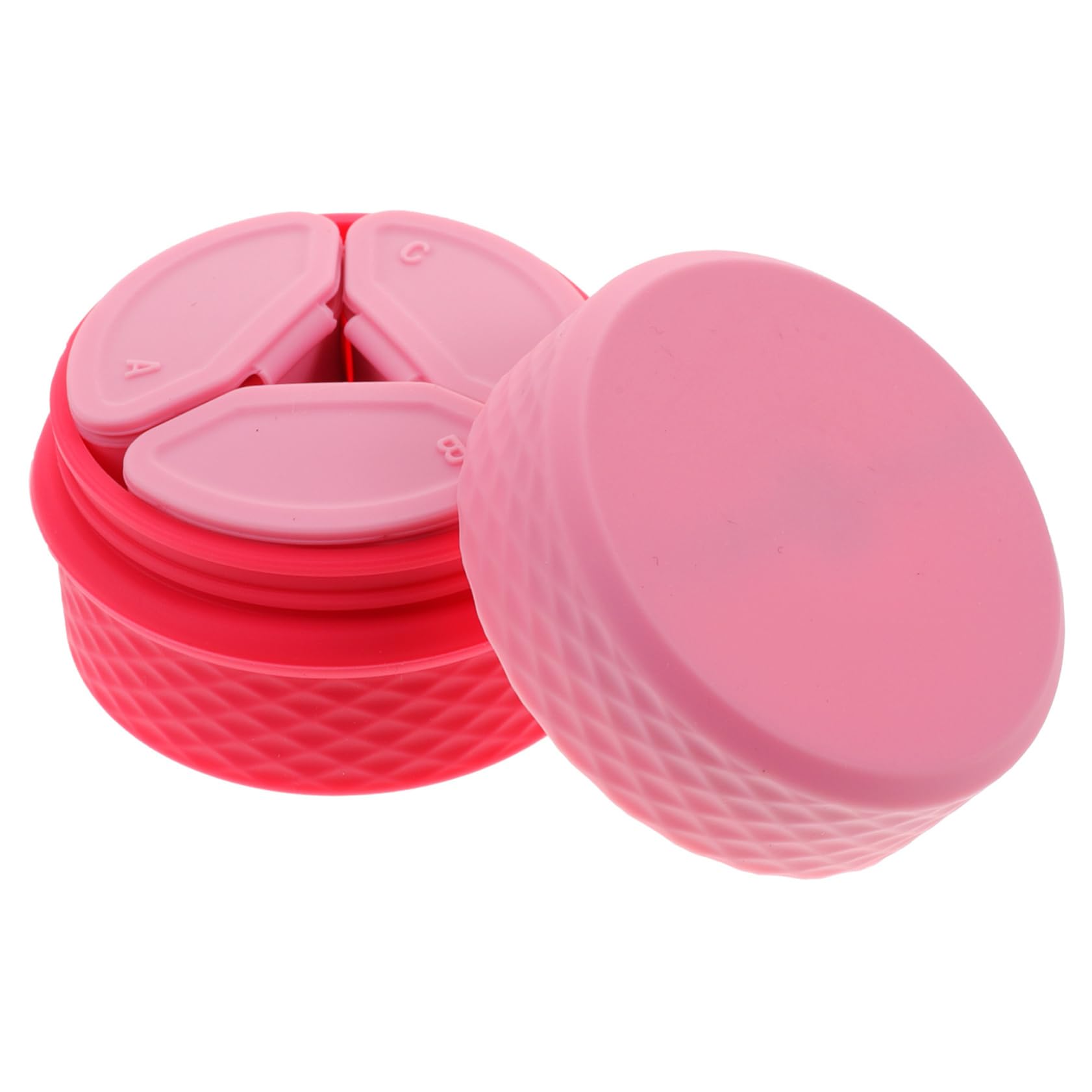Package List 1 x large box 3 x small boxes 1 x spoon Features -Size:6.50X6.50X4.50cm/2.55X2.55X1 lotion dispenser jar. -Material:Silicone cosmetic jar with lid -Color:Pink makeup sets -Compact size, portable and lightweight, travel, business trip, camping, etc toiletry bottle. -Leak-proof, you can put it into your makeup bag without worrying about the leakage toiletry container for travel. -This versatile container can be filled with your creams and used as a container for body lotion, moisturizers, face cream, etc portable cosmetic organizer. -Refillable Cream Container, making it an excellent for hair product, skin products, cleanser, and other skin care products portable cosmetic empty box. -A practical way to store while also save your cream, lotions, pills and lotion cosmetic lotion bottle. Goods Description makeup containers This durable and practical refillable Cosmetics Cream Container is made of premium material, sturdy and practical, which can serve you for a long time.travel makeup jar It is good for home and travel supply.lip scrub container This Cream Container is special for travel facial cream storageCream jar: the cream empty box adopts the reusable design, the service life is long, practical and reliable. Empty container: spiral bottle mouth design, rigorous technology, good sealing. features in simple structure, famous for practical. Empty sample container: empty sample container makeup pots container as a travel bottle, you can separate a variety of creams, such as face cream, eye cream, care products, , with the three small compartment jars. Empty makeup pot: silicone makeup containers the cream bottle comes with reusable design, service life, which is practical and reliable. Cream holder: easy to distinguish: the box cover has the words a/b/c on it, which can help you easily find the cosmetics you want.