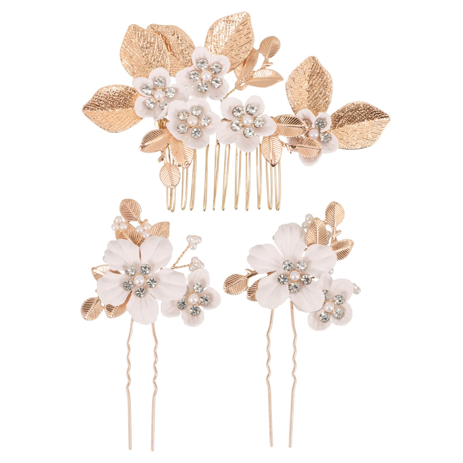 Description These hair accessories are suitable for most hair types, from thick to thin, straight to curly. Flower decoration on these hair accessories adds elegance and sophistication to your hairstyle, making them a great accessory for a variety of occasions, from weddings to parties to everyday wear. Features -Color:Golden -Material:Zinc alloy -Size:11.50X7.00X1.00cm/4.52X2.75X0.39in -Size:9.50X5.00X1.00cm/3.73X1.97X0.39in -These hair accessories are good for adding elegance and sophistication to your hairstyle, making you stand out from the crowd. -Sturdy materials used in these hair accessories ensuring durability and can withstand long-lasting use. -The flower decoration on these hair accessories is simple yet elegant, making them suitable for weddings, proms, etc. -These hair accessories are easy to use and portable, making them convenient to store and take with you wherever you go. -They make a great present option for family and friends, adding elegance and charm to their hairstyle. - Color: Golden. - Size: 11.50X7.00X1.00CM. Package Including 1 x wedding hair comb 2 x hairpins