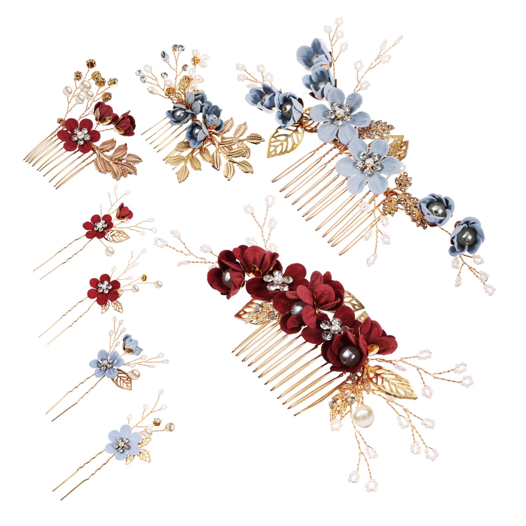 Package Include 8 x Hair Combs 8 x Hair Clips Features - Combined freely: You can wear these hair clips and combs together or individually according to your preference bridal tiaras. - Material: Alloy, faux peals, rhinestones, cloth bridal headpiece - Color: Red, blue wedding hair piece. - Fashionable design: Hair combs and hair clips are decorated with artificial floral leaves, fake pearls, rhinestones side combs,. - Wedding tiaras: You will receive hair combs and clips, beautifully designed and refined to your satisfaction wedding hair comb. - Multiple use scene: Suitable for wedding, engagement banquet, party, dance, photography, daily life, etc bridal hair pin. - Excellent effect: Delicate hair and hair clips make you elegant and beautiful and attract everyone's attention bridal hair combs. - Size:17.00X5.00X0.20cm/6.68X1.97X0 bridesmaid hair comb. wedding headpiece for bride Goods Description pearl headpiece Hair combs and hair clips, beautiful design and appearance, make you satisfied.bridal hair accessories It can meet your different makeup looks and give you a different feeling.hair clips for wedding This product is a handmade wedding hair accessory set.wedding bridal tiaras You can clip these hairbrushes together or wear them separately according to your own preferencesVintage pearl hair comb: multiple occasions: suitable for weddings, engagement parties, proms, parties, anniversaries. Hair accessories for women wedding: hair side comb clips-hair combs and hair clips are decorated with artificial floral leaves, fake pearls, rhinestones. Pearl hair clips: ?great beautiful results?: delicate hair and clips make you elegant and beautiful, attracting everyones attention. red and blue bridal hair combs, you can match them according to your makeup and clothing colors, it will have different effects and surprise everyone. Blue hair accessories: exquisite : nice options for brides, , girlfriends to make them stunning at parties. Pearl wedding hair accessories: ?handcrafted bridal hair clips?: hair combs and barrettes are embellished with faux pearls, rhinestones, faux fabric leaves, alloys. the pearls are sewn on by hand and will not fall off easily. the rhinestones are also artificially inlaid on the hair comb, and then polished, which is friendly to the scalp.