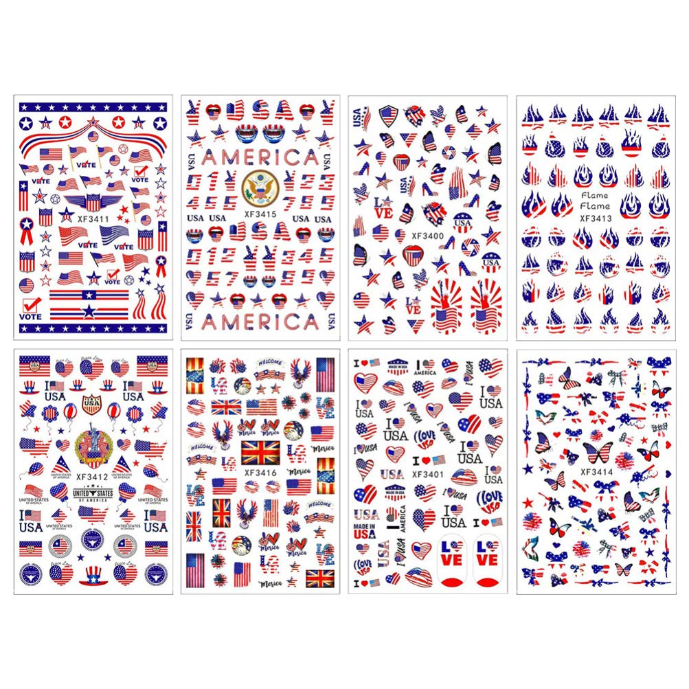 American Flag Nail Art Stickers, 8 Sheets 4th of July Independence Day Nail Art Decals National Day Manicure Decals for Memorial Day Women Girls