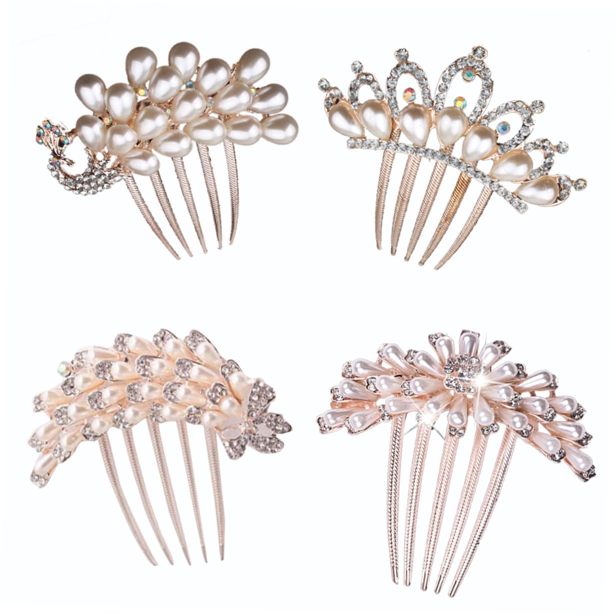 Package Include 4 x Wedding Hair Comb Alloy Rhinestones Women Hair Side Combs Bridal Head Pin Headpiece Mixed Style Features - Color: Gold Wedding Hair Comb. - Size: 9 x 8.4 x 1.5 cm Bridal Wedding Veil Comb. - Material: Rhinestone and alloy combs for women. - It's easy to put into the hair and take out but you may use extra to secure it in case accesorios para mujer. - Classic and elegant style with bling rhinestones and simulated pearls design pearl hair. - The chic design will decorate you elegant and beautiful. You will attack everyone's eye and become a shining star teg combs for women. wedding hair clip - The chic design will make you elegant and beautiful. You will attack everyone's eyes and be the spot light in the crowd Wedding Comb. Bridal Comb - It is suitable for wedding, party, bridesmaids, girls, and daily life Hair Clip Comb. Goods Information Comb for Wedding You will attack everyone's eye and become a shining star.women's hair clips The bling elegant design of rhinestones will ensure its practicability and popularity.hair jewels for women This item is manufactured with for durable and long-lasting use.combs for women Such a beautiful hair accessory will make bride more attractive and elegant