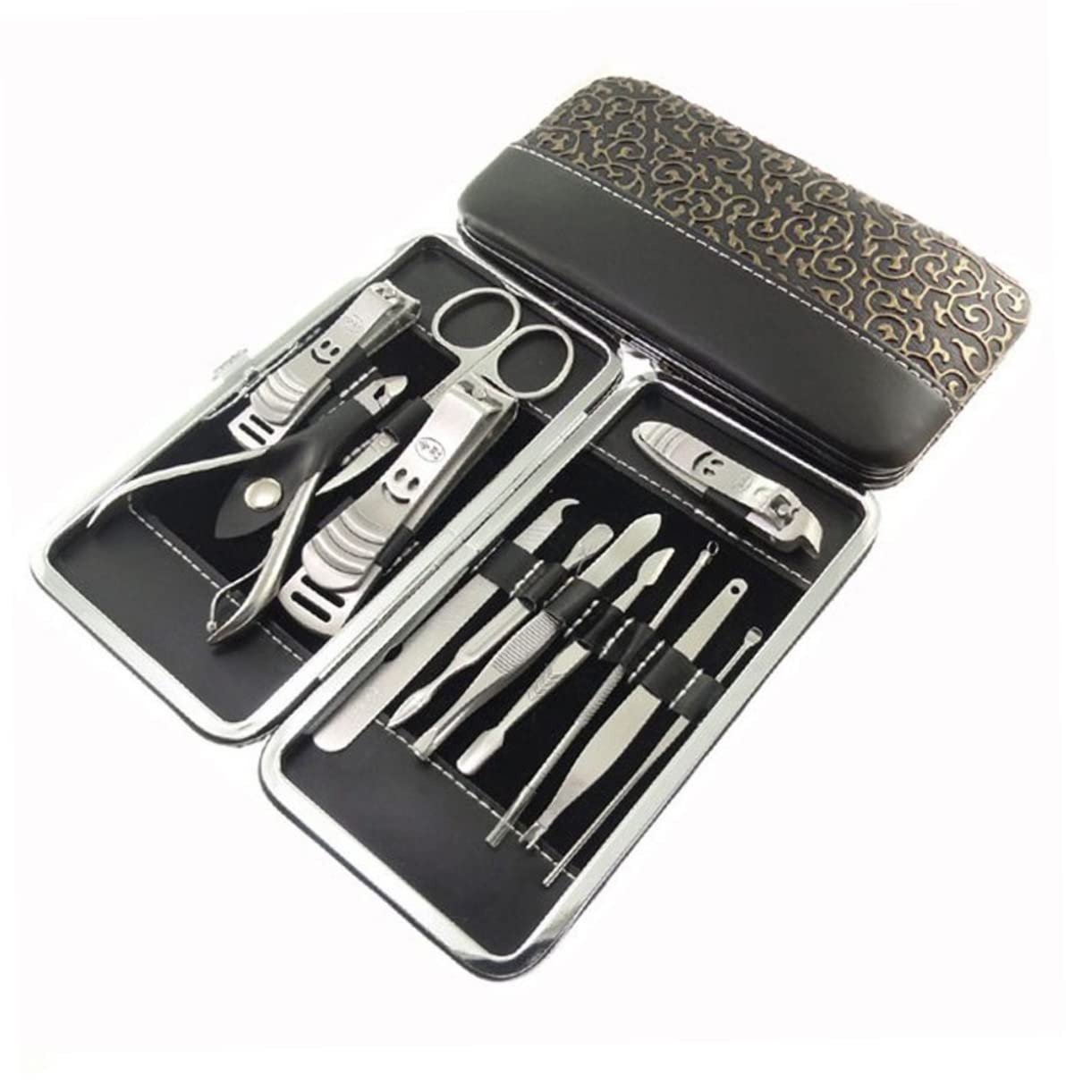 Pedicure set: professional tools you need for normal grooming, manicure or pedicure. Manicure set: with different tools such as tweezers, clipper, scissor, nail clipper, nail file, ear pick etc. Manicure kit: color: silver; pouch style: plant print. material: stainless steel. Grooming kit: great for traveling use, , favors and more. Cosmetology kit: best quality as personal manicure / nail set with delicate case.