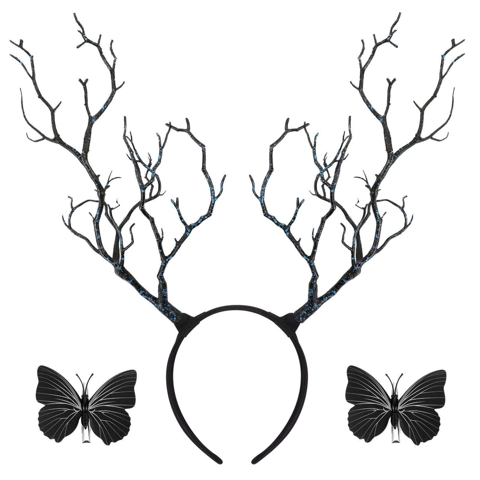 minkissy Womens Headbands Antler Headband Tree Branches Headdress with Butterflies Halloween Deer Horn Cosplay Costume Hair Accessory for Women Womens Hair Accessories Black