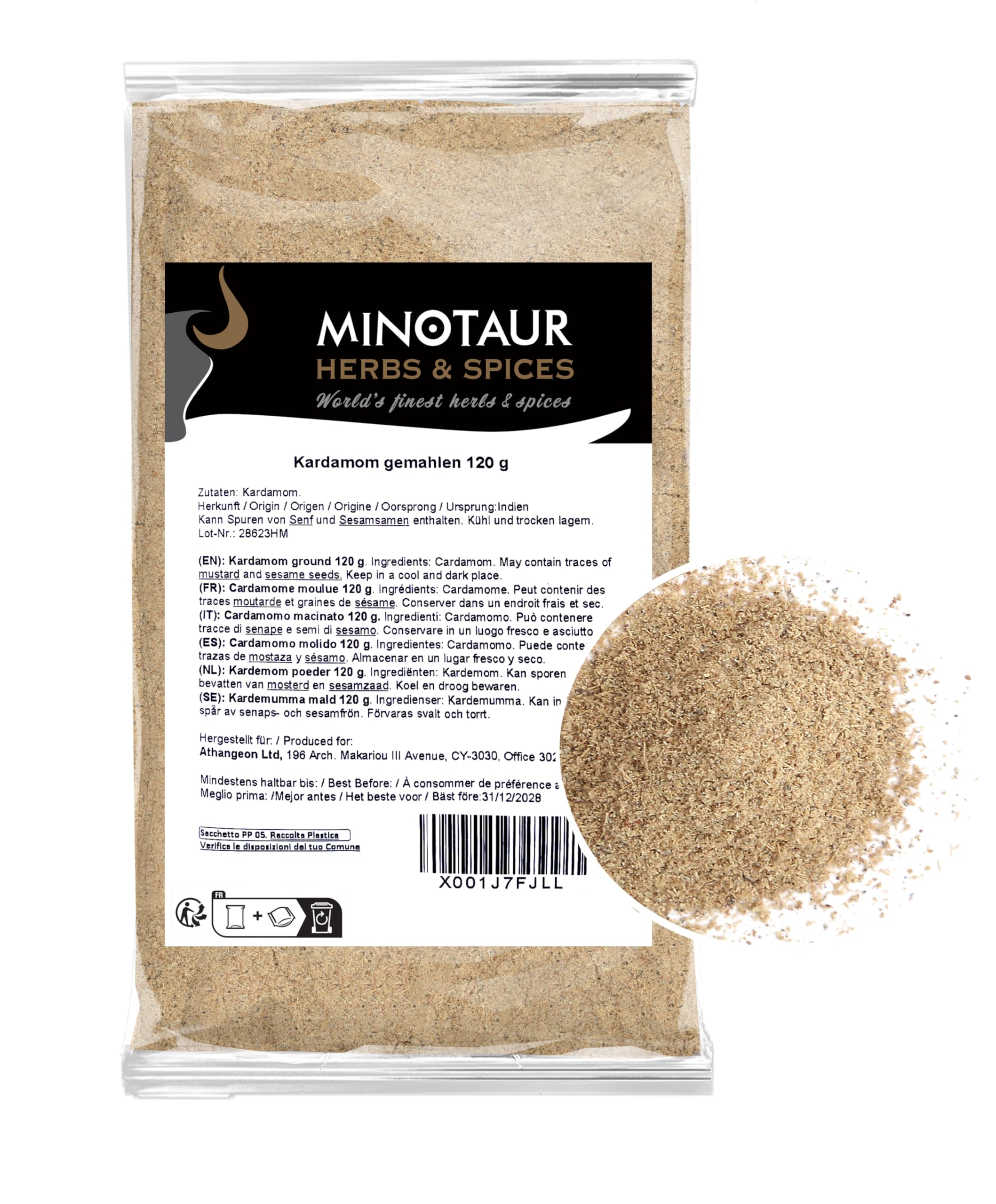 FOR SAVORY DISHES: Cardamom goes perfectly with Indian curry dishes. This exotic spice adds a spicy flavor to meat and fish dishes as well as vegetable dishes. Cardamom gives rice dishes a special aroma and a delicious taste. FOR SWEET DISHES: This spice is perfect for many desserts such as baked apple or pastries such as yeast braid. It is very popular at Christmas for speculoos, gingerbread, and stollen. Beverages such as mulled wine, chai tea, chocolate, and coffee are enhanced by cardamom. QUALITY: Natural product of the highest quality. No preservatives, no artificial additives, no flavors, no colorings, no genetic engineering, vegan. 120 GRAMS of green cardamom powder: The best value for money thanks to direct purchase in large quantities. MINOTAUR CARDAMOM: Green cardamom powder has a slightly fruity and sweet taste, accompanied by a warm and spicy note. It is very aromatic and has many applications. Ground cardamom has the advantage of being practical and easy to handle. Please keep it tightly closed.POUR LES PLATS SAVOUREUX: la cardamome se marie parfaitement avec les plats indiens au curry. Cette épice exotique donne un goût épicé aux plats de viande et de poisson ainsi qu'aux plats de légumes. La cardamome confère aux plats de riz un parfum particulier et un goût délicieux. POUR LE SUCRÉ: cette épice convient parfaitement à de nombreux desserts comme la pomme au four ou à des pâtisseries comme la tresse à la levure. Elle est très appréciée à Noël pour les spéculoos, le pain d'épices et les stollen. Les boissons telles que le vin chaud, le thé chai, le chocolat et le café sont rehaussées par la cardamome. QUALITÉ: Produit naturel de la plus haute qualité. Sans conservateurs, sans additifs artificiels, sans arômes, sans colorants, sans génie génétique, végétalien. 120 GRAMMES de poudre de cardamome verte: ?le meilleur rapport qualité-prix grâce à l'achat direct en grandes quantités. MINOTAUR CARDAMOM: La poudre de cardamome verte a un goût légèrement fruité et sucré, accompagné d'une note chaude et épicée. Elle est très aromatique et trouve de nombreuses applications. La cardamome moulue a l'avantage d'être pratique et facile à manipuler. Veuillez la conserver bien fermée.