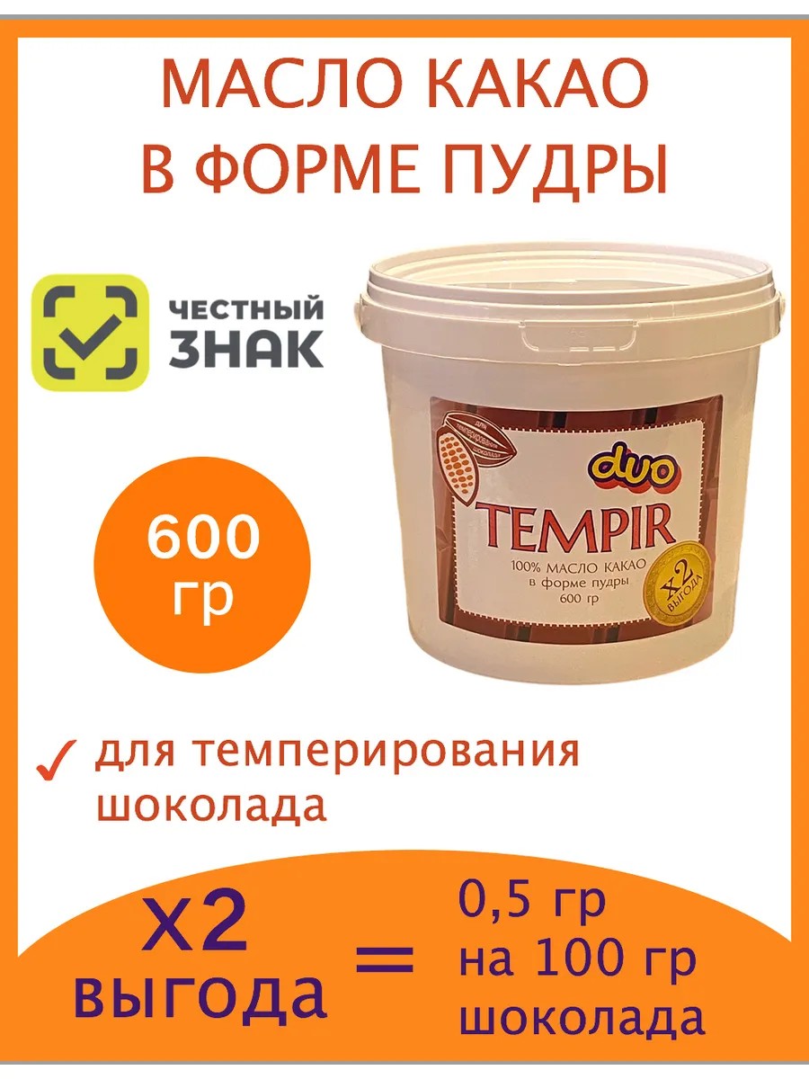 Масло какао в форме пудры Tempir Duo / Темпир Дуо это 100% натуральный ингредиент, который делает темперирование шоколада не только максимально простым, но и экономичным. Для темперирования 100 гр шоколада требуется всего половина грамма пудры какао масла Темпир Дуо. Какао масло для шоколада в форме микрио порошка состоит из очень мелких частиц, которые полностью распределяются в шоколадной массе при перемешивании, обеспечивая внесение необходимого количества стабильных кристаллов какао масла. Более того, благодаря дополнительному содержанию какао-масла шоколад получает дополнительный блеск и ярко выраженный хруст. При использовании пудры Темпир Дуо для темперирования на шоколаде не образуются белые точки и крапинки.