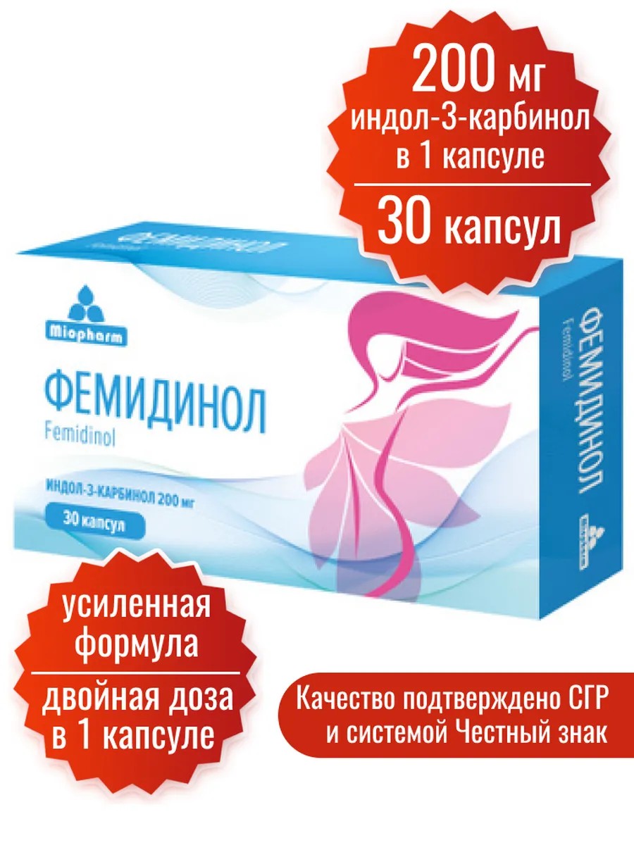 Препараты Миофарм более 8 лет продаются в аптеках по всей стране, что гарантирует высокое аптечное качество продукции, которое подтверждено СГР и системой Честный знак. Фемидинол - натуральный БАД для женского здоровья. Индол-3-карбинол, входящий в состав биологически активной добавки "Фемидинол" способствует замедлению патологических гиперпластических процессов в органах и тканях женской репродуктивной системы (молочные железы и эндометрий, миометрий, яичники, шейка матки).