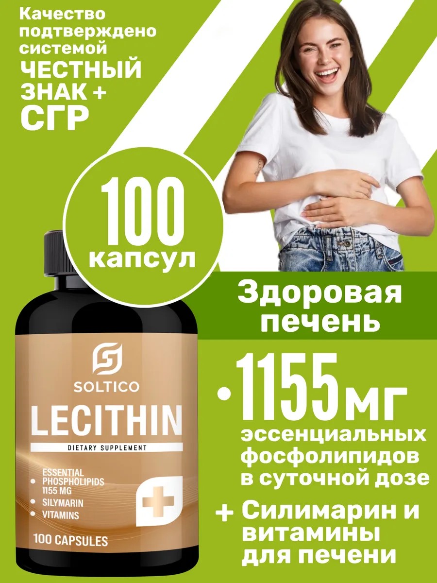 Препараты Миофарм более 8 лет продаются в аптеках по всей стране, что гарантирует высокое аптечное качество продукции, которое подтверждено СГР и системой Честный знак. Лецитин Soltico – натуральный комплекс, разработанный для поддержания и укрепления печени. Его формула на основе соевого лецитина, экстракта расторопши и витаминов группы В обеспечивает целый ряд полезных свойств. Лецитин соевый Солтико снижает риск развития сердечно-сосудистых заболеваний, способствует эффективному образованию желчи, обладает антиоксидантными свойствами. Лецитин содержит в составе эссенциальные фосфолипиды, силимарин и важные витамины для работы и защиты печени, такие как РР, Е, В1, В2, В6, В12 и другие полезные компоненты. Эссенциальные фосфолипиды - осуществляют транспортировку полезных и питательных веществ, минералов и витаминов к клеткам. Фосфолипиды укрепляют мембраны гепатоцитов, печеночных клеток, растворяют и выводят избыток жиров из печени и помогают ей справляться с ежедневной работой по очистке крови. Расторопша - природный источник силимарина, активного вещества. Силимарин является гепатопротектором, способствующим детоксикации организма после тяжелых нагрузок или неправильного питания. Наш лецитин в капсулах изготовлен из высококачественного сырья, что гарантирует его безопасность. Витамины для печени являются строительными блоками клеток и поддерживают их здоровье. Регулярное употребление комплекса витаминов способно повысить качество жизни и общее самочувствие. Природная формула данного БАД для печени позволяет эффективно очистить печень и провести детокс всего организма. Для достижения максимального результата рекомендуется принимать курсами. Взрослым по 1 капсуле 3 раза в день во время еды. Продолжительность приема: 1-6 месяцев. По рекомендации врача прием можно повторить.