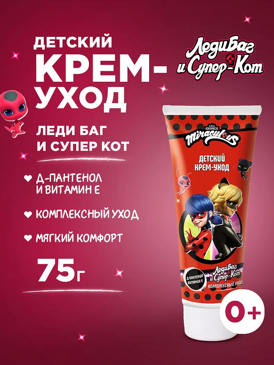 Miraculous Крем-уход детский Леди Баг и Супер-Кот 75мл. Нежный крем - это важный этап ухода за детской кожей. Сразу после купания и в любое время дня - для рук, лица и всего тела. Нежная консистенция и оптимальный состав подарят комфорт и надлежащий уход. Крем быстро впитывается, не оставляя жирных следов.Д-пантенол предохраняет чувствительную кожу ребенка от пересушивания и обеспечивает заживление раздражений и покраснений.Комплекс натуральных масел сои, какао, кокоса и рапса обеспечивает глубокое увлажнение кожи, увлажняют и смягчают кожу, стимулируют процесс регенерации клеток и при этом не закупоривает поры. Натуральный экстракт алоэ снимает воспаление и обладает природным смягчающим действием, устраняет сухость и шелушение. Состав крема адаптирован к потребностям детской кожи, не содержит парабены, синтетические масла и силиконы. Способ применения: Небольшое количество крема нанести на чистую кожу лица и/или тела мягкими массажными движениями до полного впитывания. Подходит для для детей с рождения. Использовать под присмотром взрослых! Состав: Aqua, Glycerin, Cetearyl Alcohol, Glyceryl Palmitate/Stearate, Glycine Soja Oil, Theobroma Cacao Seed Butter, Cocos Nucifera Oil, Ceteareth-23, Ethylhexyl Stearate, Hydroxypropyl Starch Phosphate, Panthenol, Parfum, Tocopheryl Acetate, Aloe Barbadensis Leaf Juice Powder, Sodium Polyacrylate, Disodium EDTA, Citric Acid, Phenoxyethanol, Ethylhexylglycerin, Sodium Benzoate, Potassium Sorbate Леди Баг и Супер Кот; детские супергерои Чудесная Леди Баг и Супер-Кот; Супер Кот: Плаг, когти; Леди Баг: Супер шанс!