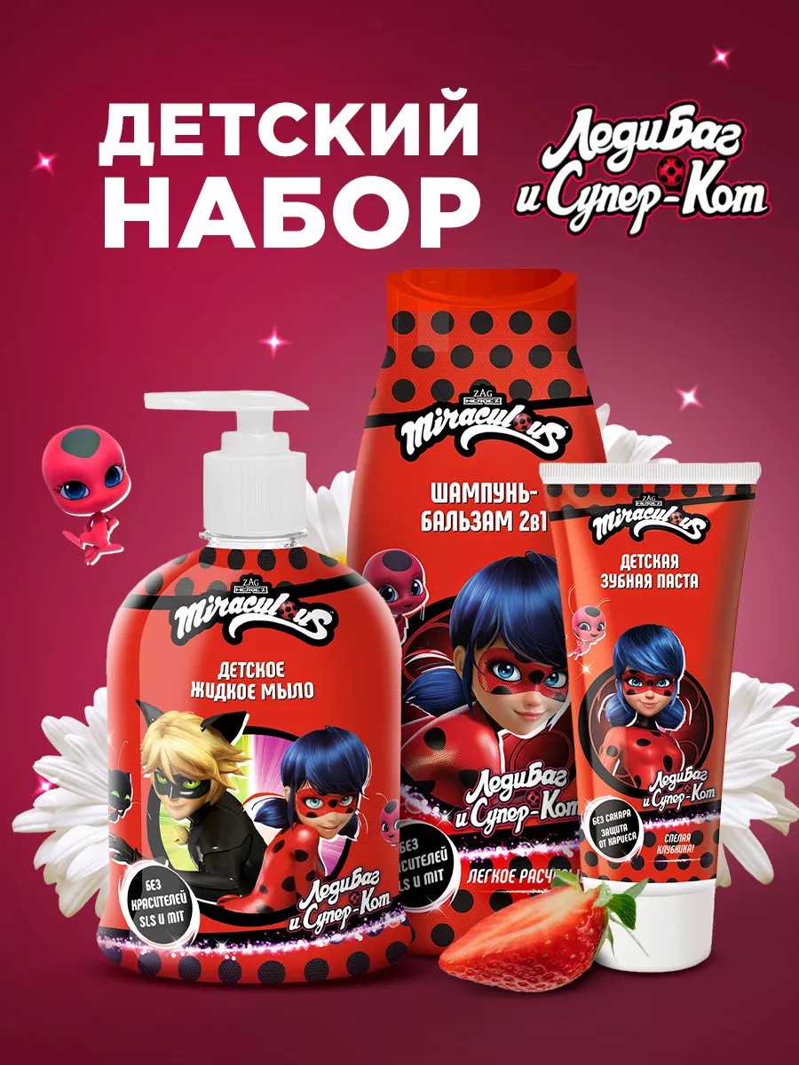 Набор детский (Подарочный набор Зубная паста детская Леди Баг 60г+Шампунь бальзам для волос детский 2в1 Леди Баг 400мл + Жидкое мыло для рук детское Леди Баг 450мл).