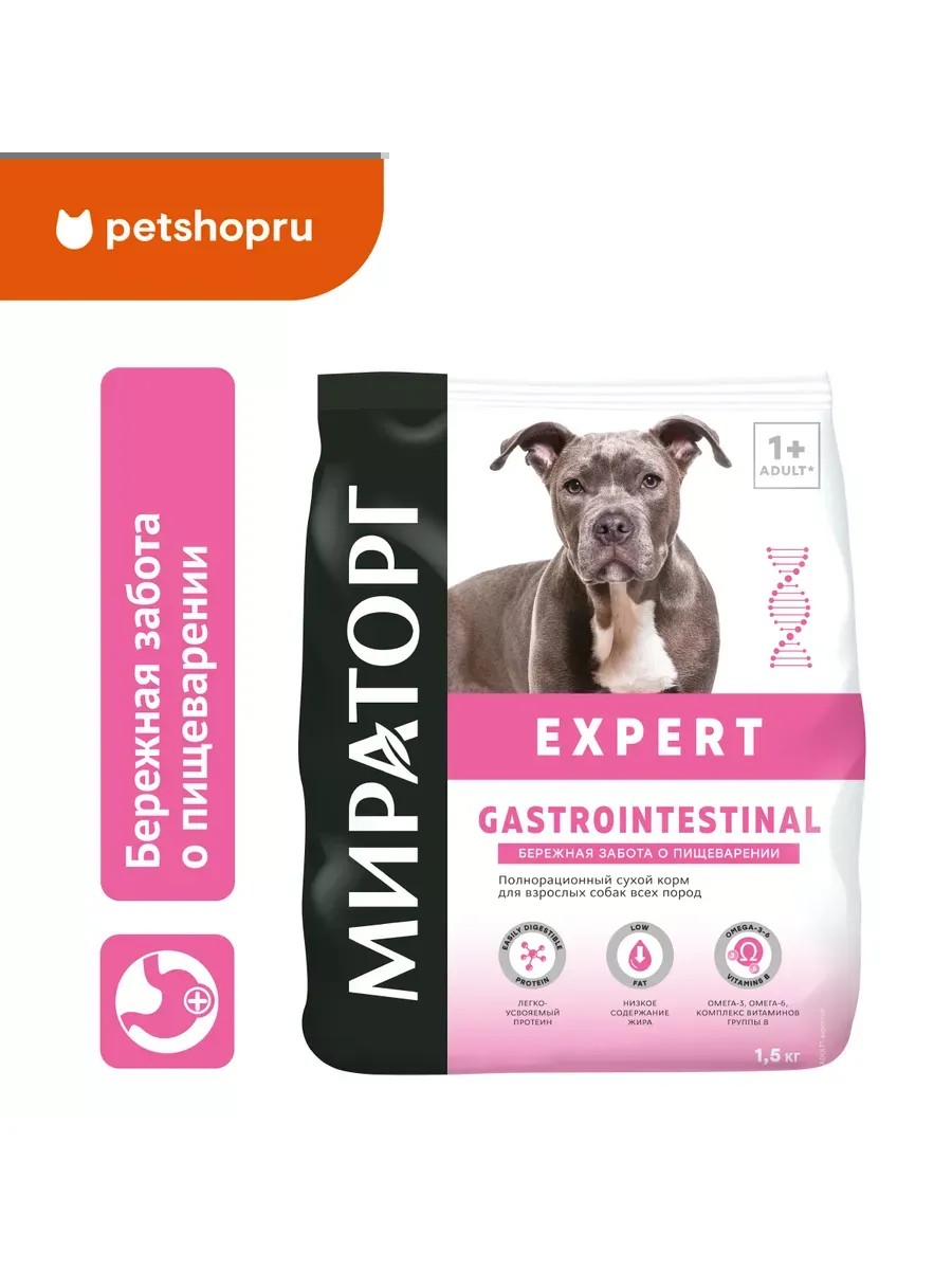 Мираторг Expert - профессиональная линейка кормов, созданная на базе современных научных исследований в нутрициологии. Сбалансированные рационы Мираторг Expert помогают вашим питомцам поддерживать здоровье и жизненную энергию. Gastrointestinal – ветеринарная диета, для защиты пищеварительной системы, которая способствует нормализации работы желудочно-кишечного тракта.