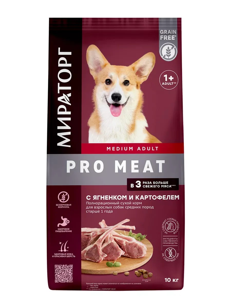 Корм МИРАТОРГ PRO MEAT создан для животных с особыми вкусовыми предпочтениями. Высокое содержание свежего диетического мяса, премиальный состав углеводов с адаптивным гликемическим индексом, умеренный уровень клетчатки, витамины и минералы обеспечат питомцев энергией для здоровой и активной жизни. Корм обогащен премиальными источниками витаминов, микроэлементов и полезных веществ. Сухой корм с ягненком для собак средних пород супер-премиум класса PRO Meat - это полноценный сбалансированный рацион, который является оптимальным выбором для кормления собак средних размеров и сочетает в себе специально отобранные питательные вещества, которые поддерживают особые потребности питомцев и сохраняют их здоровье на протяжении всей жизни.
