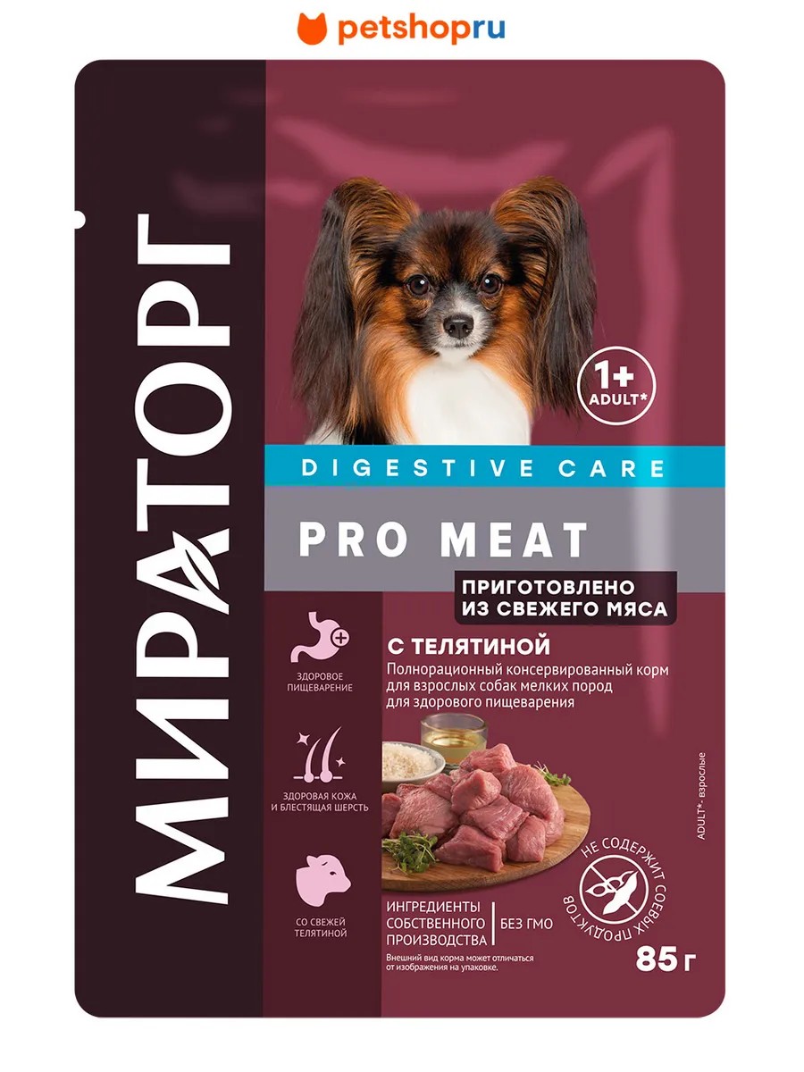 Консервированный полнорационный корм Мираторг PRO MEAT супер-премиум класса со свежим мясом создан для питомцев, особо привередливых в выборе питания. В разнообразной линейке каждый владелец сможет найти вкус, который понравится его четвероногому гурману.Пищеварительная система взрослых собак мелких пород часто бывает чувствительна к составу корма. Специально для таких собак создан консервированный корм PRO MEAT c телятиной. Мясо с высокой степенью усвояемости, сбалансированная формула витаминов, минералов и жирных кислот поддержат пищеварение питомца с учетом его индивидуальных особенностей.