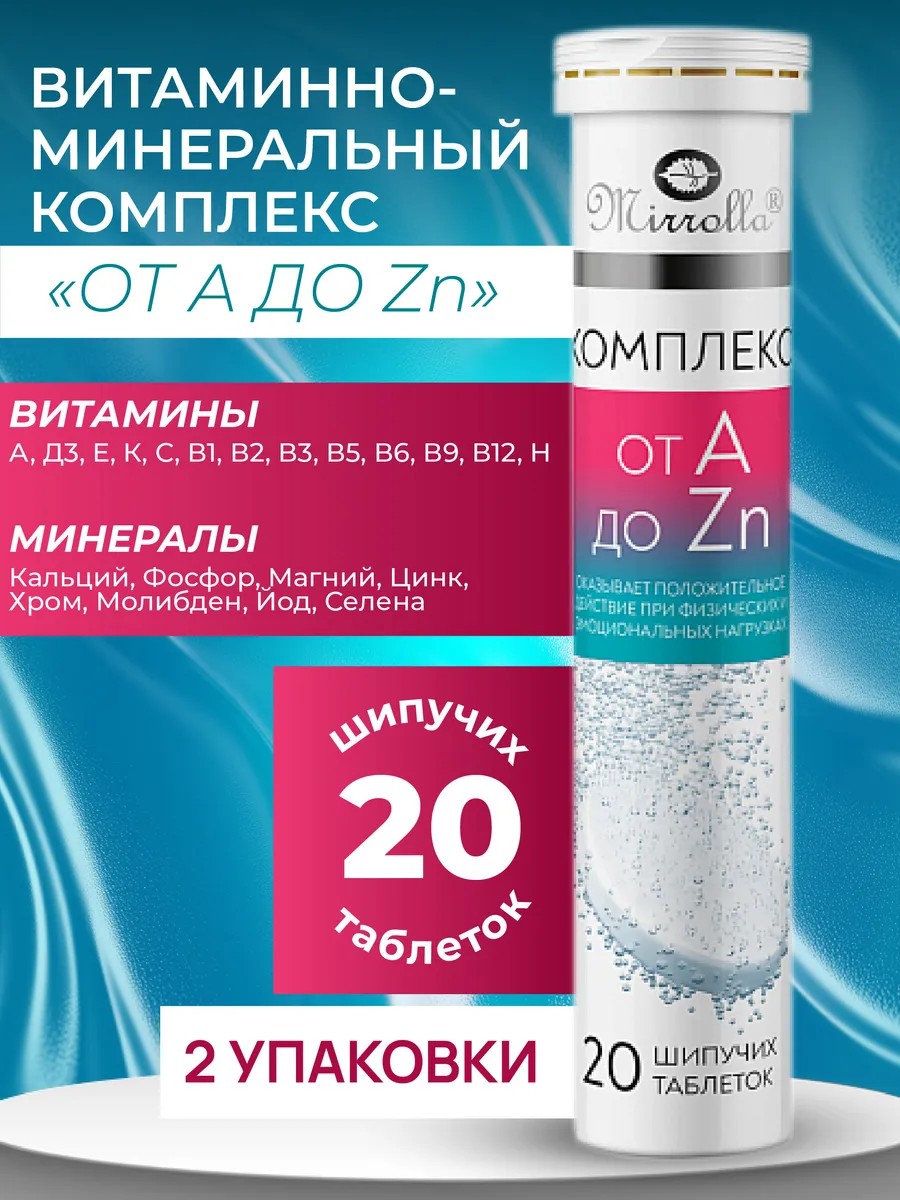 | Комплектация | Витаминно-минеральный комплекс «от А до Zn» «Мирролла», шипучие таблетки 20 шт - 2 упаковки |