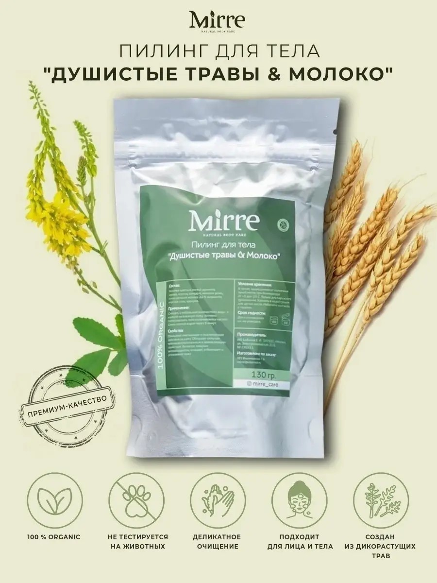 Травяной пилинг для лица и тела создан из 100% натурального органического сырья. Представляет собой смесь молотых трав, произрастающих в дикой природе, дополненных сухим цельным молоком. Череда оказывает смягчающее и заживляющее действие на кожу тела. Обладает сильными противовоспалительными свойствами. После первого применения пилинга на коже лица вы получите подтянутый овал и кожу, сияющую изнутри. Пилинг можно использовать как отшелушивающее средство для тела, так и в виде маски для лица. Пилинг для тела: смешайте небольшое количество композиции с водой в ладошке и нанесите на влажную кожу. Помассируйте получившейся пастой. Смойте теплой водой через 5 минут.Маска для лица: смешаете композицию с маслом, которое подходит для вашего типа кожи, с кисломолочной сывороткой или сметаной и получите прекрасную расслабляющую маску для лица или тела. Она наносится на 15-20 минут на теплую, влажную кожу, смывается водой.Состав: молотые цветы и листья донника, череда, корень солодки, молотая рожь, сухое цельное молоко 26 % жирности, морская соль, куркума.