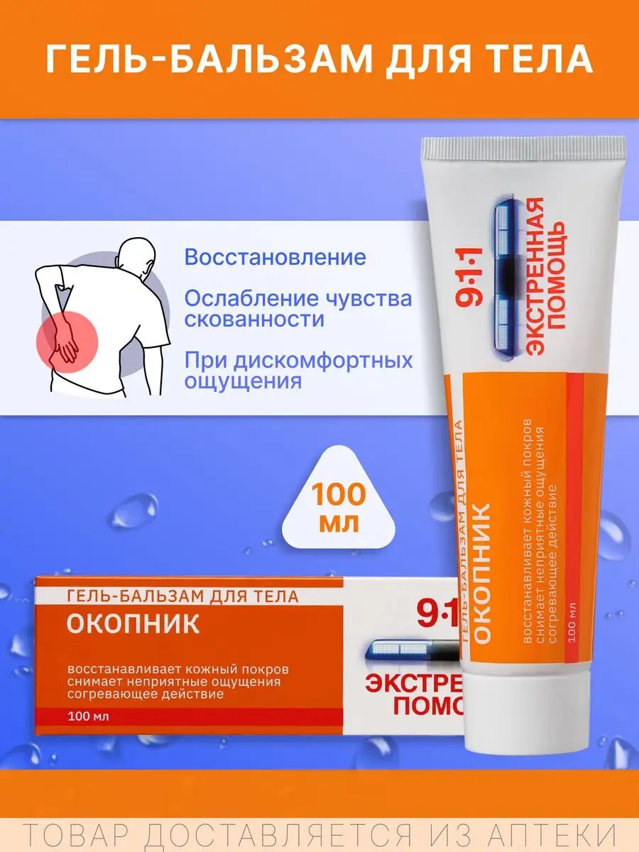 | Комплектация | Окопник 911 гель от боли в суставах 100мл - 1 шт; 911 Окопник от болей |
