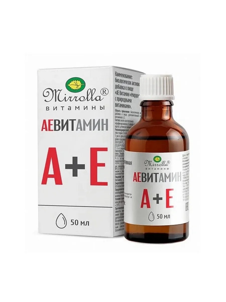Mirrolla АЕ витамин с природными витаминами - это биологически активная добавка (БАД) к пище - комплекс, рекомендованный в качестве дополнительного источника витаминов А и Е.