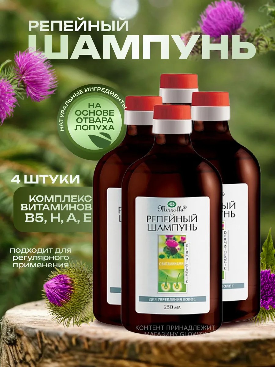 MIRROLLA, Шампунь репейный с комплексом витаминов для укрепления волос 250 мл, 4 шт.