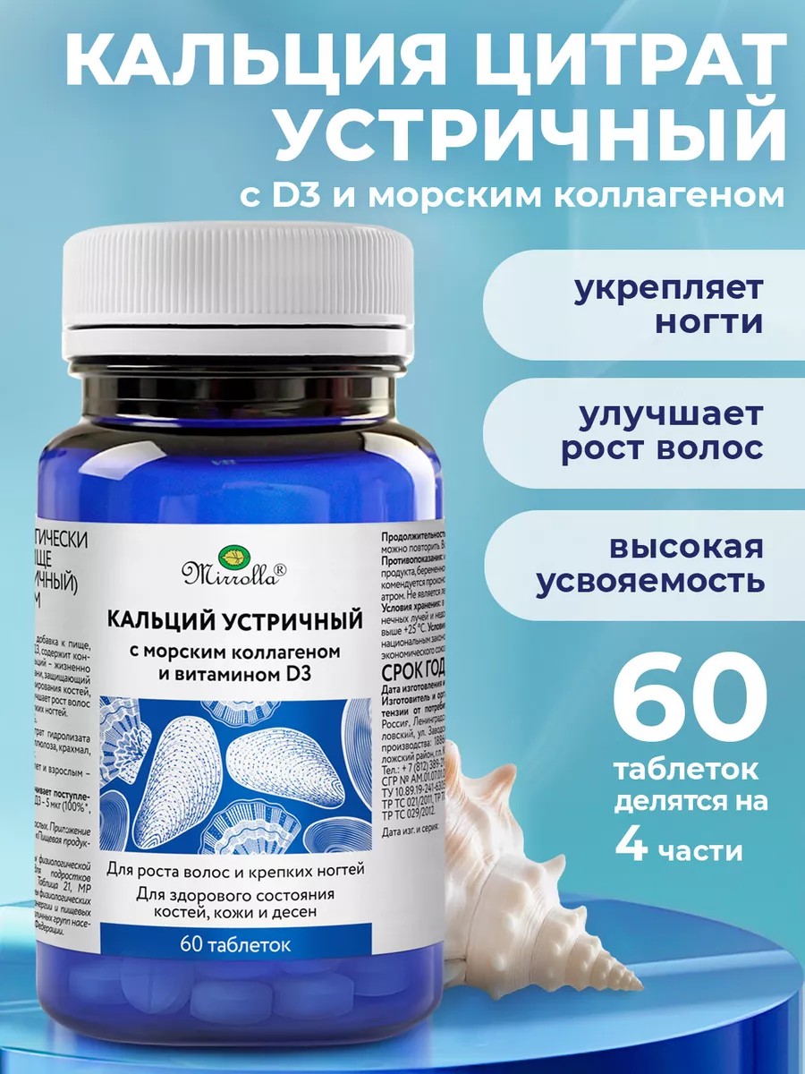 Биологически активная добавка Кальций устричный Mirolla представляет собой уникальную комбинацию кальция, морского коллагена и витамина Д3. Цитрат кальция - это форма кальция, хорошо усваиваемая организмом. К его преимуществам относят и отсутствие побочных эффектов, аллергии, хорошую переносимость и детьми, и взрослыми. Кальций жизненно важный строительный материал для костной ткани, защищающий от развития остеопороза, необходим для формирования костей, здорового состояния десен и кожи. Он играет важную роль в процессах регуляции деятельности сердца и передачи нервных импульсов. Кальций - макроэлемент «красоты», он улучшает рост волос и делает их сильными, способствует росту крепких ногтей. Коллаген – это важный для организма нитевидный белок, который составляет основу соединительной ткани. Это один из ключевых компонентов суставов, костей, сухожилий, волос, кожи, ногтей и зубов. Морской коллаген способствует упругости кожи и замедляет процесс старения. Витамин Д3 не только повышает усвояемость кальция, но и оказывает положительное влияние на иммунную систему. При недостатке витамина D большая часть кальция не усваивается пищеварительной системой. Принимая Устричный кальций с морским коллагеном и витамином Д3 ваш организм получит максимальную пользу от этого ценного продукта.