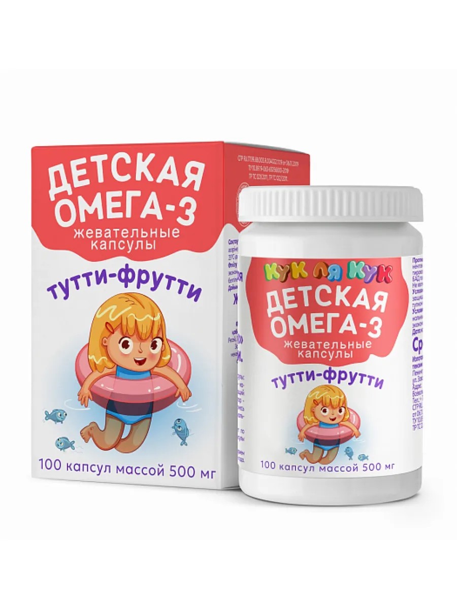 Цветные жевательные капсулы Омега «Кук Ля Кук» со вкусом тутти-фрутти для детей с 3х лет восполняют недостаток полиненасыщенных жирных кислот Омега-3, необходимых для полноценного развития детского организма.