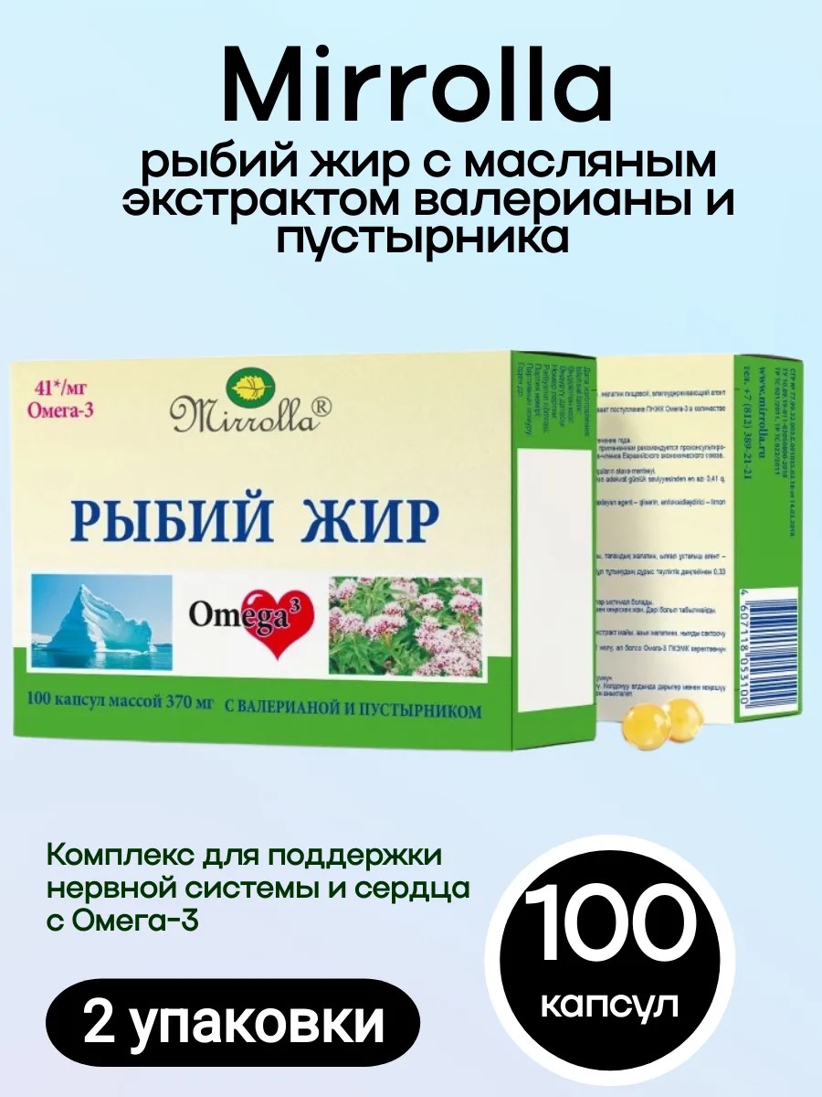 РЫБИЙ ЖИР МИРРОЛЛА С МАСЛЯНЫМ ЭКСТРАКТОМ ВАЛЕРИАНЫ И ПУСТЫРНИКА N100 КАПС ПО 370МГ