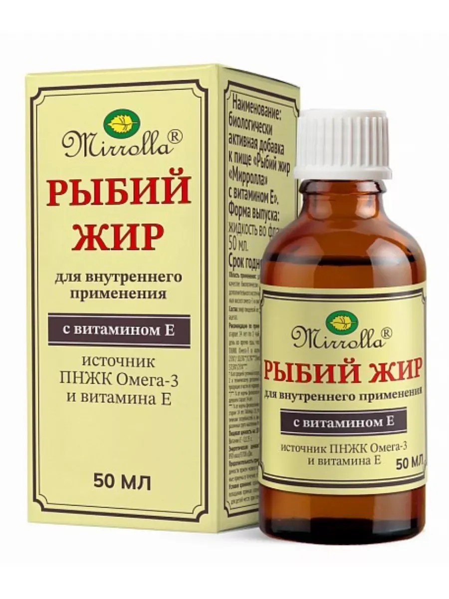 | Торговое наименование | биологически активная добавка к пище "Рыбий жир "Мирролла" с витамином Е" (капсулы массой 370 мг, 700 мг, 1300 мг, жидкость во флаконах от 30 мл до 1000 мл) |