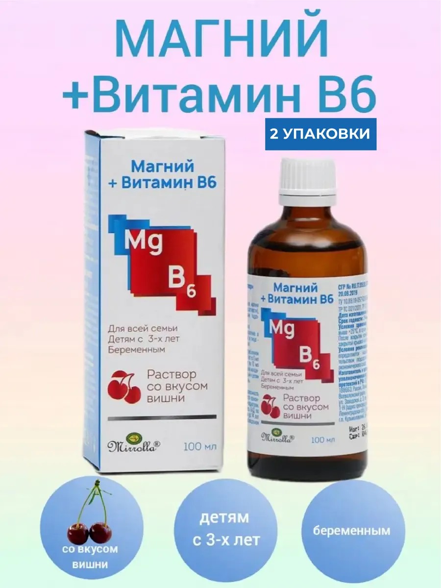 Магний В6 жидкий со вкусом вишни удобная и легкоусваиваемая форма с приятным вкусом. Раствор магния для детей помогает концентрировать внимание, помогает запоминать информацию и способствует эффективному обучению. Жидкий магний для женщин необходим во время беременности. Нехватка магния может негативно сказаться на формировании органов плода. Магний Б6 детский восполняет дефицит магния у детей. Дефицит магния во время беременности способен вызвать повышение тонуса матки. Когда магния не хватает, защитные силы организма истощаются. Человек постоянно ощущает себя усталым, появляется тревожность и нервозность, дают о себе знать нарушения сна, могут отмечаться боли в мышцах. Все неприятные симптомы проходят, стоит только восполнить дефицит магния. Компания Мирролла предлагает как раз такой препарат — сироп со вкусом вишни. Главное действующее вещество — лактат магния. Это одна из самых легкодоступных для организма форм магния. Добавка способствует защите от стресса и несет в себе всю пользу магния и витамина В6. Подходит не только беременным и кормящим женщинам, но и детям после 3 лет.