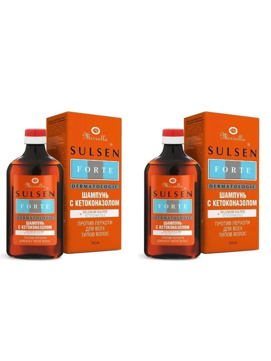 мирролла сульсен форте шампунь с кетоконазолом против перхоти 250мл. устраняет перхоть и признаки себорейного дерматита, снимает неприятный зуд и шелушение кожи, стимулирует рост волос против перхоти для всех типов волос кетоконазол, дисульфид селена