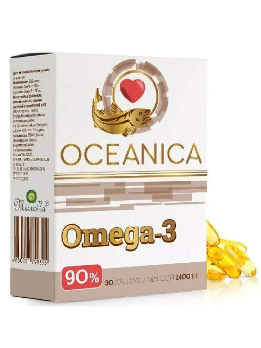 ОКЕАНИКА ОМЕГА 3-90% N30 КАПС ПО 1400МГМягкие желатиновые капсулы одинаковой конфигурации без натеков и вмятин с равномерной по толщине оболочкойБиологически активная добавка к пище.
