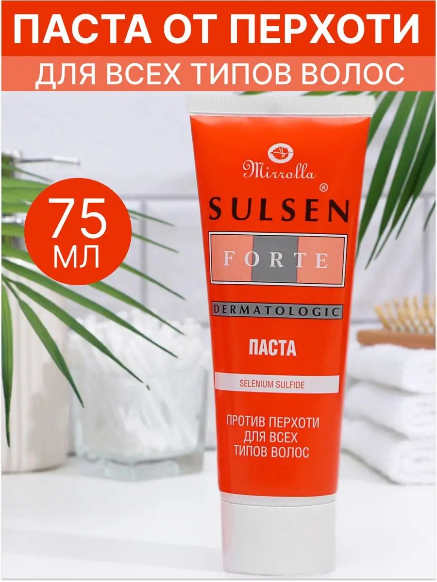 Действие средства:- Уменьшает проявление перхоти. - Снижает интенсивность зуда и успокаивает кожу головы. - Усиливает барьерные функции эпидермиса кожи головы. - Восстанавливает структуру волос.**Способ применения:** вымыть волосы шампунем Mirrolla Sulsen Forte. Тщательно втереть пасту массажными движениями в корни волос. Выдержать на волосах 5-10 минут, смыть тёплой водой. Продолжительность приема: использовать через день на протяжении 4-6 недель, после чего перейти на регулярное применение пасты ещё в течение 1,5-2 месяцев. Повторять курс по необходимости. Состав: Aqua, Cetearyl Alcohol, Cetrimonium Chloride, Propylene Glycol, Polyquaternium-7, Ethylhexyl Cocoate, Cetearyl Alcohol (and) Dipalmitoylethyl Hydroxyethylmonium Methosulfate (and) Ceteareth-20, Selenium Sulfide, Allantoin Acetyl Methionine, Arctium Lappa Root Extract, Chelidonium Majus Extract, Cyclopentasiloxane, Peg-12 Dimethicone, Salicylic Acid, Phenoxyethanol, Ethylhexylglycerin, EDTA, Parfum.